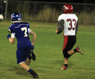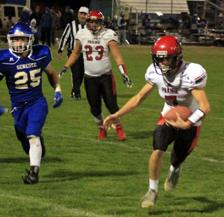 Genesee received the opening kickoff and on their second play from scrimmage quarterback Dawson Durham connected with receiver Cy Wareham for a 72 yard touchdown. Prairie stopped the 2-point try making opposing teams 0 for 10 on the season on 2-point tries. It didn’t take Prairie long to answer as the Pirates needed just 4 plays to move the ball 54 yards for a score. Cole Martin picked up 8 and Owen Anderson followed with a 15 yard run. Cole Schlader completed a 9 yard pass to Sam Mager and then Martin ran a sweep around left end for 22 yards and the tying touchdown. Anderson ran in the 2-pointer to give Prairie an 8-6 lead. On Genesee’s next possession they tried the Durham to Wareham connection 3 more times but it netted just 1 completion for 6 yards and Genesee had to punt. Prairie took over at their own 31 and in 6 plays added another touchdown. The big plays were a 24 yard pass completion from Schlader to Derik Shears and a 29 yard run by Martin that set up first and goal at the 4. Anderson wound up scoring the touchdown on a 1 yard run. Schlader then ran in the 2-pointer to make it 16-6. 3 incomplete passes and Genesee had to punt gain. The punt went just 10 yards as Prairie took over at the Genesee 37. Martin went 18 yards around left end then burst through the middle for 19 yards to make it 22-6. The 2-point run came up short. There was a stiff breeze blowing at Genesee and Dean Johnson’s kickoff wound up going into the end zone for a touchback. 3 passes netted a 1 yard loss forcing another punt into the wind. Shears took the punt at the Prairie 45 and returned it to the Genesee 11. A pass interference penalty against Genesee in the end zone moved the ball to the 6. Schlader ran the ball in from there on the next play to make it 28-6 as again the 2-point try came up short. Genesee tried running the ball on their next possession and did no better, gaining just 5 yards on 3 plays before punting again. The punt went just 18 yards before going out of bounds at the Genesee 43. Prairie needed just 1 play to score again as Mager caught a screen pass from Schlader and maneuvered his way 43 yards for the touchdown. Brody Hasselstrom ran in the 2-pointer to make it 36-6 with 4:33 still to go in the first quarter. A Prairie penalty and a 20 yard pass completion helped Genesee moved the ball to the Prairie 28. Durham then tried passing out to the left side and the ball went off his receiver’s hands right to Martin, who caught the ball at the 25 and sprinted 75 yards for another Prairie touchdown. Schlader passed to Shears for the 2-pointer to make it 44-6 with 2:52 left in the first quarter. At that point it looked like they had a shot at Prairie’s 55 point first quarter explosion at Genesee back in 2009. In that Oct. 9 game Prairie scored 3 touchdowns in the final minute, 2 on defensive scores. Genesee was able to run 3 plays and punted with Prairie taking over at their own 49. Hasselstrom gained 16 yards on a pitchout to the right as the first quarter ended. Anderson added 12 yards and then Schlader connected with Shears on a crossing pattern for 25 yards and another touchdown to make it 50-6 just 19 seconds into the second quarter. Genesee then used a Prairie pass interference penalty and two Wareham catches that combined for 36 yards to move to the Prairie 35. After 3 incomplete passes a fourth and 10 pass completion gained just 5 yards and Prairie took over on downs at the 30. On the next play Hasselstrom ran a simple trap up the middle and burst through for 70 yards and another Prairie touchdown. T.J. Hibbard ran in the 2-pointer to make it 58-6. Genesee’s next possession ended on a fumble as Johnson recovered at the Prairie 20 and returned the ball to the 17. Hasselstrom ran for 9 yards to the 8 and Hibbard scored on the next play. Mager, who was in at quarterback for the last 2 series, ran in the 2-pointer to make it 66-6. 3 incomplete passes for Genesee and they had to punt again. This time they punted with the wind and got off a 50 yard punt that rolled dead at the Prairie 13. A couple of penalties worth 15 yards had the Pirates facing a third and 25 from their 13. Schlader completed a pass to Dalton Ross, who made a tough catch in coverage, for 22 yards to the 35. On fourth and 3 Hasselstrom broke loose for his second long touchdown of the game as he went 65 yards this time. Schlader passed to Shears for the 2-pointer to make it 74-6 with still 3:55 left in the half. Genesee lost yardage on 2 plays and had to punt on fourth and 17 from their own 18. Shears made a fair catch at the Genesee 48. Prairie wasn’t trying to score as coach Ryan Hasselstrom called for a quarterback sneak. However, you can’t tell your players not to compete and Schlader wound up gaining 37 yards on the play. After