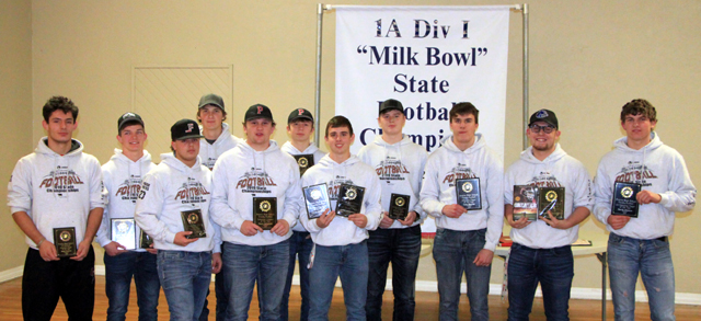 The JV and varsity football award winners at the team’s awards banquet Sunday at the Community Hall. From left are Jesse Cronan, JV defensive player of the year; T.J. Hibbard, JV most valuable and varsity special teams player of the year; Brody Hasselstrom, JV offensive player of the year; Matt Coppernoll, JV defensive lineman of the year; Dean Johnson, varsity defensive lineman of the year; Sam Mager, varsity Pirate award; Owen Anderson, varsity MVP and co-defensive player of the year; Shane Hanson, JV offensive lineman of the year; Cole Martin, varsity offensive player of the year; Hayden Uhlenkott, varsity offensive lineman of the year and Brandon Burlsworth Award winner (a national character award-Burlsworth was an Arkansas player who wore black rimmed glasses, hence the glasses Hayden is wearing), and Derik Shears, varsity co-defensive player of the year. The Prairie Pirates opened their season with a pair of losses as they fell to the Grangeville Bulldogs 51-61 at the Idaho County Shootout Friday, Dec. 6 at Cottonwood and then lost 57-80 at St. Maries Saturday, Dec. 7.
