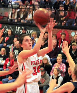 Genesee’s offense was dominated by Bailey Leseman who led all scorers with 27 points. Unfortunately for Genesee the rest of their team could muster only 7 points. Prairie jumped out to a 6-0 lead in the game as Ellea Uhlenkott, Ciara Chaffee and India Peery each scored a basket. Leseman scored a 3-pointer to get Genesee on the board but Prairie then scored the next 11 straight points for a 17-3 lead. Uhlenkott sank 2 free throws and Peery converted a 3-pont play. Madison Shears made a free throw then Delanie Lockett score a basket and Peery finished off the run with a 3-pointer before Leseman scored again to break the run. Uhlenkott added a basket and a 3-pointer while Shears and Chaffee each added a basket as Prairie led 26-12 at the end of the first quarter. Chaffee scored the first 3 points of the second quarter, all on free throws. Uhlenkott added a basket after a steal and Kristin Wemhoff added a free throw as Prairie extended the lead to 32-12. The scoring was even the rest of the half as Prairie took a 39-19 lead into the break. Both side suffered cold shooting in the third quarter as Genesee hit just 1 of 11 shots while Prairie was a little better at 2 for 8. One of Prairie’s 2 baskets happened to be a 3-pointer by Chaffee while Peery was 4 for 4 at the line in the quarter as Prairie outscored Genesee 9-7 as Genesee was 5 for 7 in the quarter at the line. Prairie took a 48-26 lead into the fourth quarter. Lockett opened the fourth quarter scoring with a basket. Leseman then scored 5 straight points for Genesee but Prairie answered with a 6-0 run with Shears scoring 5 of those 6 to push the lead to 56-31. Leseman added a free throw and a basket and Tara Schlader scored a free throw to finish off the game. Shears, Uhlenkott and Peery each scored 13 points to lead the team and Chaffee was also in double figures with 10. Lockett added 6 points and Wemhoff and Schlader scored 1 each. Prairie had a 48-43 edge on the boards led by Schlader who had 12 rebounds. Chaffee added 9 and Uhlenkott 8. Uhlenkott and Shears each had 6 steals and Peery added 4. Uhlenkott also had 6 assists. Prairie was 17 for 54 from the field, 31%, and 19 for 32 at the line, 59%. Genesee was 9 for 54 from the field, 17%, and 16 for 22 at the line, 73%. In the JV game Prairie routed Genesee 67-17. Prairie jumped out to a 17-5 lead and led 23-12 at the end of the first quarter as Molly Johnson scored 7 points and Josie Remacle and Hope Schwartz each scored 6 while Laney Forsmann scored the other 4 points. Prairie had scoring runs of 6 and 12 in the second quarter as they took a 41-14 lead by halftime. Remacle added another 6 points in the quarter while Ali Rehder scored 6 as well. Rehder also hit a 3-pointer. Prairie shut out Genesee in the third quarter 18-0 as they had a scoring run of 30 points that last from the 4:34 mark of the second quarter to the 7:45 mark of the fourth. Remacle added 8 more points in the third quarter to win up with a game-high 20. The fourth quarter was played with a running clock and Olivia Klapprich scored 6 of Prairie’s 8 points while Riley Enneking scored the other 2 as Prairie went on to win by 50. As mentioned, Remacle topped the scoring with 20 points with Johnson and Schwartz each adding 12. Klapprich scored 9, Rehder 6 and Forsmann and Enneking 4 each. Prairie had a 48-42 rebounding edge led by Johnson who had 12. Remacle added 8 rebounds. Johnson had 6 steals while Klapprich and Forsmann added 5 each as Prairie forced 35 turnovers. Forsmann and Klapprich each had 2 assists. The JV’s were 28 for 75 from the field, 37%, and 10 for 19 at the line, 53%. Genesee was 7 for 36 from the field, 19%, and 2 for 8 at the line, 25%. Prairie 26 13 9 9 -57 Genesee 12 7 7 8 -34 Prairie-Lockett 3-7, 0-0, 6; Shears 4-12, 4-8, 13; Uhlenkott 4-9, 4-6, 13; Peery 3-14, 6-8, 13; Chaffee 3-6, 3-4, 10; Schlader 0-3, 1-4, 1; Wemhoff 0-2, 1-2, 1; Bruegeman 0-2, 0-0, 0. 3-pointers-Shears, Uhlenkott, Peery, Chaffee. Genesee-Hanson 0-3, 0-0, 0; Parkins 0-9, 1-2, 1; Leseman 7-28, 11-14, 27; Monk 1-6, 0-0, 2; Osborne 0-4, 2-2, 2; Bartosz 0-3, 0-0, 0; Murray 0-0, 0-0, 0; Stout 0-1, 2-2, 2; Mayer 0-0, 0-0, 0; Ranisate 0-1, 0-2, 0. 3-pointers-Leseman 2. Seniors Peery and Chaffee had combined for just 9 points at Grangeville but came up big this time with 13 points each with Chaffee scoring 8 in the first half and Peery 9 in the second half. P eery