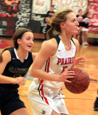 Grangeville tied it late to make it 6-6 at the end of the first quarter, a far cry from the 6-19 lead Grangeville had the first game at that point. Shears opened the second quarter scoring with a 3-pointer and Chaffee added a lay-up for an 11-6 lead. Grangeville answered with 5 straight points to make it 11-12 with 4:41 left in the half. Prairie shut out Grangeville the rest of the half while scoring 8 straight points. Perry put the Pirates back on top with a bank shot and Chaffee added a pair of lay-ups. Shears sank both ends of a 1 and 1 to give Prairie a 19-12 lead at the half. Prairie made it 11 straight points by scoring the first 3 of the third quarter as Shears scored a basket and Peery a free throw for a 22-12 lead. A basket each by Chaffee and Lockett and a 3 by Peery put Prairie up 29-15 late in the third quarter. Grangeville got a 3 from Camden Barger to close out the quarter with Prairie up by 11 at 29-18. Barger sank another 3 to open the fourth but Peery was fouled on a drive to the hoop and converted a 3-point play to put Prairie back up by 11. After a Grangeville free throw, Chaffee converted a 3-point play to make it 35-22. Grangeville managed to cut the lead to 7 at 39-32 and again at 40-33 but could get no closer. Shears sank 2 free throws to put Prairie up by 9 with 36 seconds left. Each team added a free throw in the final 22 seconds for the final tallies. Peery and Chaffee led the scoring with 13 points each while Shears was also in double figures with 10. Lockett scored 3 while Uhlenkott and Wemhoff added 2 each. Grangeville had the rebounding edge 31-34. Peery led Prairie with 8 rebounds while Chaffee and Uhlenkott each had 7. Zoe Lutz led the Bulldogs with 12. Peery, Uhlenkott and Chaffee had 2 steals each while Peery and Uhlenkott each had 4 assists. Prairie cut their turnovers against Grangeville from over 30 in the first game to just 17 this time, while forcing Grangeville into 21 turnovers. Prairie was 14 for 38 from the field, 37%, and 13 for 23 at the line, 57%. Grangeville was 9 for 42 from the field, 21%, and 13 for 21 at the line, 62%. Prairie is now 5-1 on the season and 2-0 in league play. The JV played Wednesday, Dec. 4, at Grangeville and won their game 48-14, outscoring Grangeville 30-0 in the second half. Prairie 6 13 10 14 -43 Grangeville 6 6 6 16 -34 Prairie-Lockett 1-5, 1-2, 3; Shears 2-6, 5-8, 10; Uhlenkott 1-4, 0-0, 2; Peery 5-12, 2-3, 13; Chaffee 5-9, 3-3, 13; Wemhoff 0-1, 2-7, 2; Schlader 0-1, 0-0, 0. 3-pointers-Shears, Peery. Grangeville-Barger 3-11, 2-4, 11; Hill 0-0, 0-0, 0; Lutz 0-1, 3-4, 3; Vanderwall 3-15, 1-2, 7; Canaday 1-2, 3-4, 5; Brown 0-5, 2-2, 2; Smith 1-4, 1-2, 3; Bashaw 0-1, 0-2, 0; Roberts 1-3, 0-0, 3. 3-pointers-Barger 3, Roberts.
