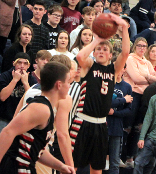 Grangeville scored the first 4 points of the game then Prairie answered with a 9-0 run. Derik Shears drove the baseline for a lay-up then Cole Schlader scored Prairie’s next 7 points. He had a baseline jumper, a 3-point play and 2 free throws as Prairie took a 9-4 lead. Grangeville came back to tie it at 9 and had a chance to retake the lead before Schlader stole the ball and drove in for a basket. Shears scored a putback just before the buzzer to make it 13-9 at the quarter break. Grangeville scored first with a free throw in the second quarter but Prairie answered with a 3 by Zach Rambo. A Grangeville basket was answered by a basket by Shears that was set up with a steal by Damian Forsmann. After another Grangeville basket, Prairie scored 6 straight on a lay-up by Owen Anderson and a pair of hoops by Schlader for a 24-14 lead. A Grangeville basket was answered with a 3 by Anderson for a 27-16 lead with 3:13 left in the half. Grangeville cut the lead down to 6 with a basket and a 3-pointer but Shears scored on a putback and Forsmann sank a 3-pointer to push the lead back to 11. After a Grangeville basket and a free throw by Sam Mager, it was 33-23 at the half. Anderson opened the second half scoring with a 3. After a Grangeville basket, Forsmann and Anderson each hit a 2-point basket for a 40-25 lead. Grangeville cut the lead to 8 with a 0-7 run but a basket by Anderson and free throw by Brody Hasselstrom put the lead back to 11. Hasselstrom’s free throw came when he went in to shoot for Schlader who had been fouled going to the hoop after making a steal. Schlader crashed into the padding and suffered some kind of knee injury that put him out the rest of the game. A 3 by Grangeville was answered by a lay-up by Shears and then Forsmann scored after making a steal. After 2 Grangeville baskets cut the lead to 8, Hasselstrom then sank a 3 on a feed from Kyle Schwartz. That made it 50-39 heading into the fourth quarter. Grangeville opened the fourth quarter with a 0-5 run that cut the lead to 6 but Prairie came right back with a 15-0 run that pretty much put the game away. Forsmann opened the run with a pair of 3-pointers. Mager followed with a pair of baskets. Mager then made an offensive rebound and kicked the ball out to Hasselstrom for a 3-pointer. Shears scored inside to make it 65-44 with 2:52 left to play. Grangeville finally broke their nearly 4-minute scoring drought with a free throw. Rambo answered with a short jumper. Grangeville scored the next 5 points to cut the lead to 67-50 with 1:00 left but Prairie scored the final 2 points when Anderson made 2 free throws for the 19 point final margin. Anderson led the scoring with 14 points while Schlader and Forsmann scored 13 each and Shears scored 12. Hasselstrom scored 7 and Mager and Rambo each scored 5. Prairie