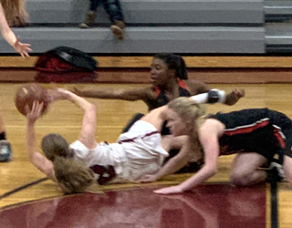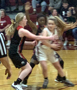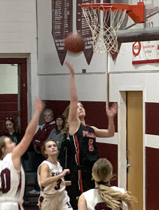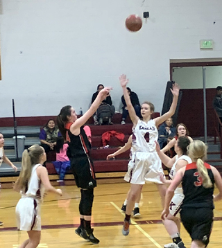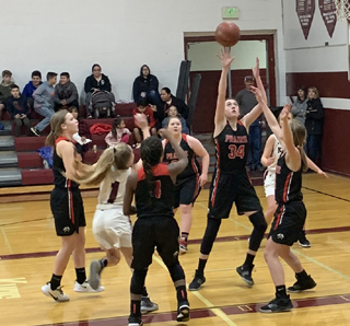 Ciara Chaffee shoots from the lane as Kristin Wemhoff, 3, and Tara Schlader look to rebound. All photos by Shari Chaffee PIRATES GIRLS BASKETBALL SCHEDULE FOR 2019-2020 *indicates league game 21-Orofino, there, won 64-25 25-Lewiston JV, there, won 93-64 26-Grangeville, there, lost 45-47 6-Grangeville, here, Idaho County Shootout, V only, 6:00 p.m., won 43-34 9-JV vs. Deary, here, 6 p.m. 10-C.V., there, 1/2 JV game, won 77-29 12-Salmon River, there, V only, 6 pm MST, won 53-35 14-Troy Quad, here*, V only, 1p.m., won 67-23 19-Lapwai, here*, lost 48-66 26-28-JV at Avista JV Christmas Tournament at Lewiston, 1:30 p.m. 8-JV at Jenifer 9th grade, 5 p.m. 9-Kamiah, there*, 1/2 JV, won 50-15 10-Salmon River, here, 5 p.m., cancelled due to weather 11-Troy Quad, there*, V only, 5:30 p.m., postponed due to weather 13-Genesee, there*, postponed due to weather 16-Lapwai, there*, V only, 7:30 p.m. 17-Potlatch, there* 20-Genesee, there, 4:30 p.m., rescheduling of Jan. 13 game 21-Orofino, here, V only, 6 p.m. 22-Lewiston JV here, 5 p.m., rescheduling of Jan. 6 cancelled game 27-JV vs. Deary, there, 5 p.m. 28-Troy, there, rescheduled from Jan. 11 30-C.V., there*, 1/2 JV Feb. 1-Potlatch, here*, 1 p.m. Feb. 4-12 -District at LCSC 13-State Play-In at Post Falls 15-State Play-In at Fruitland 20-22-State at Nampa (Columbia High School) In italics are changes and JV game additions |