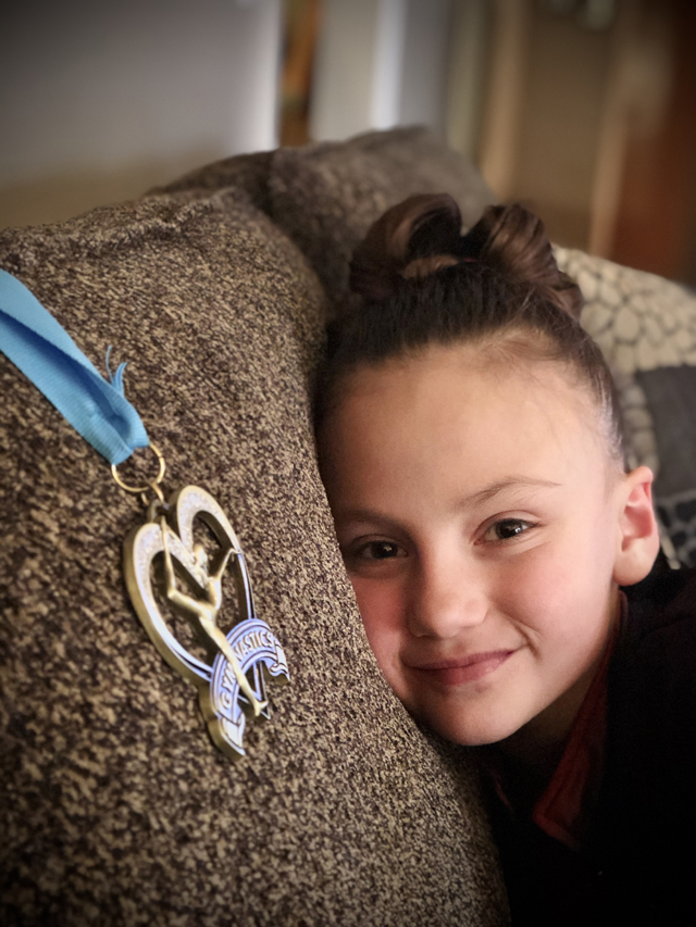 Marji Remacle with one of her medals from a recent gymnastics competition. Photo by Diana Remacle. |