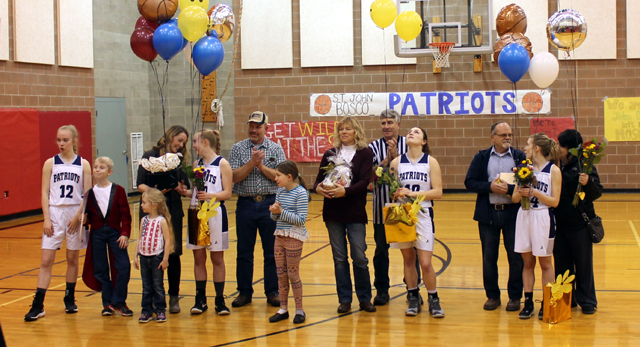 The St. John Bosco girls celebrated Senior Night Monday against Logos. Jessie Sonnen, Erin Chmelik and Lexi Currier and their families were honored. Photo submitted by Julie Sonnen.