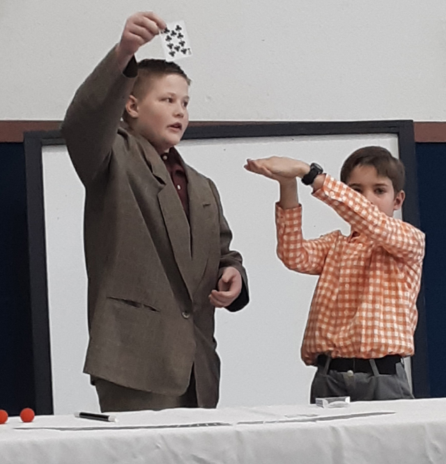 Noah Beckman performs a card trick with Pierce Frei as his assistant.