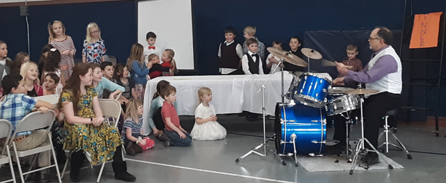 Principal Jim Hickel performs on the drums. Lady Patriots win 1 of 3 The St. John Bosco Lady Patriots played 3 games this past week. They opened with a 40-25 win over Highland at Craigmont Tuesday, Jan. 28. On Friday, Jan. 31 they hosted Deary and lost 29-40. On Monday, Feb. 3 they hosted Logos on Senior Night and lost 29-32. They will play Deary again in a loser-out game District tournament game at Lapwai this Thursday, Feb. 6 at 6 p.m. as the #5 seed. Bosco pulled away in the second quarter though as they got their offense going and outscored the Huskies 15-7 to take a 20-12 halftime lead. Bosco outscored the Huskies just 11-9 in the third quarter as they took a 31-21 lead into the fourth quarter. Bosco outscored Highland 9-4 in the fourth. Lexi Currier led the Patriots in scoring with 13 points while Erin Chmelik was right behind with 11 points. Jade Prigge scored 9 with Jessie Sonnen scoring 4, Dani Sonnen 2 and Makayla Rose 1. Currier had the Patriots only 3-pointer in the game. Prigge led in rebounds with 13 while Chmelik had a double-double with 10 rebounds and added 4 steals. Jessie Sonnen had 6 steals. SJB 5 15 11 9 -40 Highland 5 7 9 4 -25 SJB-Chmelik 5, 1-4, 11; D. Sonnen 0, 2-4, 2; Currier 5, 2-3, 13; Prigge 4, 1-4, 9; J. Sonnen 2, 0-0, 4; Rose 0, 1-2, 1. 3-pointers-Currier. Highland-Crea 1, 0-0, 3; P. Crow 2, 3-5, 8; Dau 1, 0-0, 2; Goeckner 1, 0-0, 3; T. Crow 1, 1-2, 3; Miller 2, 2-2, 6. 3-pointers-Crea, P. Crow, Goeckner. Deary extended the lead in the third outscoring Bosco 11-16 to take a 20-34 lead into the fourth. Bosco outscored the Mustangs in the fourth but not by enough to get back in the game. Prigge scored 14 to lead the Patriots. Chmelik scored 7 with Currier scoring 6 and Rose 2. Currier hit a pair of 3-pointers for her 6 points. SJB 6 3 11 9 -29 Deary 5 13 16 6 -40 SJB-Chmelik 3, 1-2, 7; D. Sonnen 0, 0-2, 0; Currier 2, 0-0, 6; Prigge 6, 2-3, 14; Rose 1, 0-0, 2. 3-pointers-Currier 2. Deary-Heath 4, 0-2, 10; Beyer 3, 0-0, 7; Anderson 2, 0-0, 4; M. Proctor 0, 0-0, 0; Henderson 0, 0-0, 0; Gregg 1, 0-0, 2; Wood 2, 0-0, 5; E. Proctor 3, 0-3, 6; Ellsworth 0, 0-0, 0; Workman 1, 0-0, 2; Ashmead 2, 0-0, 4. 3-pointers-Heath 2, Beyer, Wood. Logos took a 3-10 lead by the end of the first quarter and the Patriots spent the rest of the game trying to catch up. Bosco trailed 10-19 at the half and 18-29 after 3 quarters. They rallied in the fourth, outscoring Logos 11-3, only to fall short. Currier led the Patriots in scoring with 12 points while Prigge was also in double figures with 10. Jessie Sonnen scored 4 and Dani Sonnen scored 3. Bosco ends their regular season at 4-8 both on the season and in league play. SJB 3 7 8 11 -29 Logos 10 9 10 3 -32 SJB-Chmelik 0, 0-0, 0; D. Sonnen 1, 1-2, 3; Currier 2, 5-8, 12; Prigge 2, 6-8, 10; J. Sonnen 2, 0-0, 4; Rose 0, 0-0, 0. 3-pointers-Currier. Logos-Miller 0, 1-2, 1; L. Wilson 2, 0-1, 4; Meyer 3, 0-0, 6; Wambeke 2, 0-0, 4; Driskill 0, 0-0, 0; J. Urqidez1, 0-0, 2; L. Urquidez 1, 0-0, 2; Casebolt 2, 0-0, 5; Michaels 3, 0-0, 6; A. Wilson 1, 0-0, 2. 3-pointers-Casebolt.