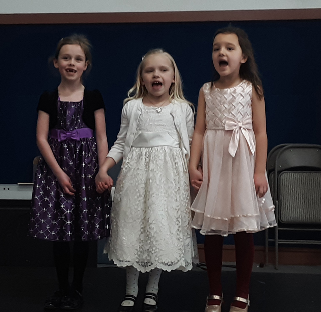 St. John Bosco Academy celebrated our namesake's feast day last week with a talent show. St. John Bosco used to do street performances of juggling and magic tricks in his native Italy, which drew in crowds of children. He always prayed with the children before and after each show to encourage them in their faith. The SJB talent show had a variety of acts including juggling, magic tricks, singing, hula hooping, a one-minute hair competition, piano playing and drumming. Shown are Cassidy Bock, Madison Duman and Kaelyn Lustig perform a song. Photo by St. John Bosco Academy.