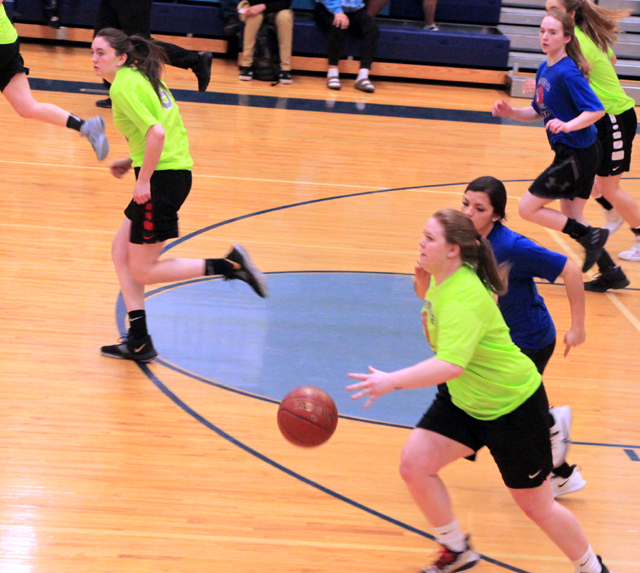 Ciara Chaffee, left, heads up the floor as India Peery handles the ball at the All-Star Game at Lapwai on Monday.