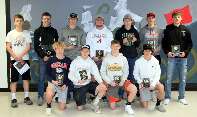 Boys Basketball awards were handed out Tuesday, March 10. Front from left are Kyle Schwartz, JV Coach's Award; Travis Alfrey, JV Pirate Award; Lane Schumacher, JV Most Valuable, and Wyatt Ross, JV Coach's Award. Standing from left are Tyler Wemhoff, JV Defensive Award; Zach Rambo, Varsity Most Improved; Sam Mager, Varsity Defensive Award; Hayden Uhlenkott, Varsity Coach's Award; Ryan Wemhoff, JV Most Improved; Damian Forsmann, Varsity Most Valuable; and Derik Shears, Varsity Pirate Award. PIRATES BASEBALL SCHEDULE FOR 2020 March 19-Genesee, there, 4:30 p.m.-postponed 23-Lapwai at Lewiston, 4:30 p.m.*-postponed 26-Kamiah, there, 4:30 p.m.-postponed 27-Troy at Lewiston, (2), 4 & 6 p.m.* - postponed 14-Kamiah, here, 4:30 p.m. 16-Lewis County, here, 3:30 p.m. 18-C.V., here, 10 a.m. 20-Genesee, here 4:30 p.m. 21-Lapwai, here, 4:30 p.m. 25-Potlatch, there, (2) 12 noon & 2 p.m. 28-C.V., there, 4:30 p.m. 8-9-District at Orofino 15-16-State at Orofino *Games in Lewiston will be played at Clearwater Park |