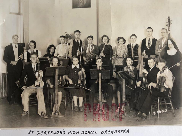 The St. Gertrude’s Academy High School Orchestra from about 1938. Vince Hattrup is at left with the violin and apparently that is William Kaschmitter on the far right with a violin. Bernard Kopczynski is holding the bass back right. Mark Forsmann is back left with the drumsticks. Any other identifications would be helpful. Photo courtesy of Don Kopczynski. Click on the photo for a larger view.