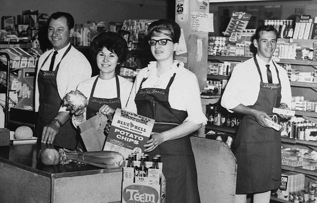 Riener’s Grocery in the early 1960’s. From left are Urbie Riener, Shirley Duman Gehring, Kathleen Jenny Stubbers and Tom Riener. Some this still look the same like the daily calendar on the post and the personal hygiene products still appear to be in the same place. The white shirts and ties got phased out long ago though.  Photo courtesy of Don Kopczynski. Click on the photo for a larger view.