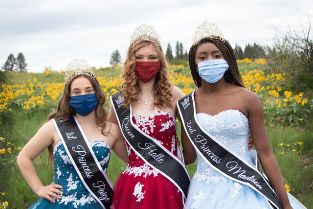 It’s definitely the 2020 Royalty when a mask is part of your royalty outfit. Each member of the royalty has a mask to match their gowns. From left are 1st Princess Paige Layman, Queen Halle Klapprich and 2nd Princess Madison Shears. Click on the photo for a larger view.
