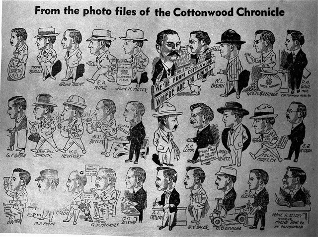 We have seen this before but don’t remember when it ran. Shown are caricatures of the Cottonwood businessmen of the time. Likely 1920’s or 1930’s. Photo courtesy of Don Kopczynski. Click on the photo for a larger view.