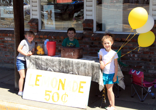 From left Charlee Key, Cooper Lockett and Lilyanna Lockett were selling lemonade Monday afternoon in front of The Bent Hinge. Click on the photo for a larger view.