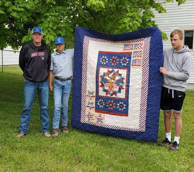 On May 23rd Travis Bruegeman was presented a quilt of valor for his time served in the Marines.  The Cottonwood Quilt of Valor group (Lynn Sonnen, Judy Forsmann, and Milton Baerlocher) were there to present it to him.  Milton said that Shirley Baerlocher had picked this quilt out especially for Travis before she passed away.  Helping hold the quilt is Travis' son Zaylor and Milton's grandson Drew Hottinger.  Photo submitted by Kristi Bruegeman. Click on the photo for a larger view.