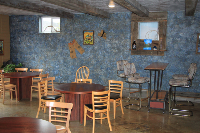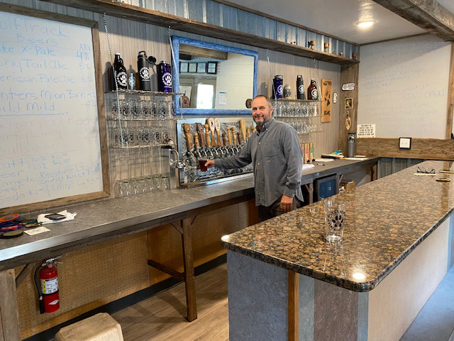 A couple more photos of the remodeled WolfTrack Brewing. The seating area with the rustic old-west style roof beams and John Candalot at the tap area. John says he can use larger kegs now and he has an onsite cooler.