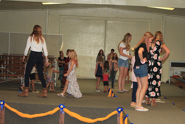 Fashion Board members work with younger models at a modeling clinic held prior to judging Monday morning. Click on the photo for a larger view.