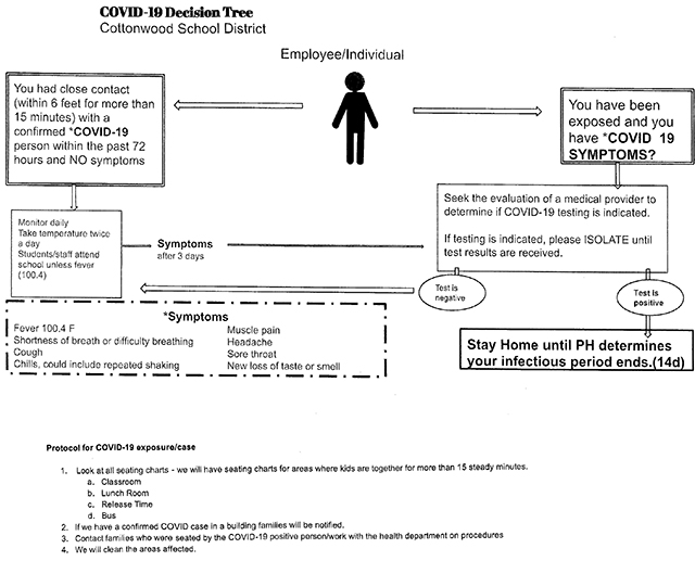 School Board meets With about 20 extra people in attendance the school board discussed and approved a decision tree plan and a sports re-entry plan for the upcoming school year. Of those in attendance Carissa Jones, Sarah Walsh and Ryan Hasselstrom spoke up about their support for the board and their decision to proceed with in school instruction. The board had approved a school re-entry plan at the July meeting. At this meeting they approved a decision tree chart showing procedures that will be followed in case of a positive test. Superintendent Rene’ Forsmann said although they recommend the use of masks, they will not be required. Also approved was an athletics plan put forth by Jon Rehder. Rehder said football and cross country will not require participants to wear masks. In volleyball, players on the bench would be required to mask up but those on the court would not be. He also said at least a couple of league schools will require masks for spectators coming into their gyms. In other action the board approved authorization of “teacher to new” for Julie Schumacher and Jeff Martin who are both in the midst of taking classes needed for certification for classes they are teaching. The board accepted the resignation of Sherry Gehring as an elementary teacher. Forsmann said she had 6 people apply and would interview 3 of those Tuesday, Aug. 18 and make a decision on hiring with the board’s blessing. District and School Handbooks, bus routes and the Elementary and Jr./Sr. High school schedules were all approved. Kayla Schumacher was approved for hire to the Jr./Sr. High Para Professional Position that opened when Aimee Uhlenkott moved out of the district. The District will have a Back to School Meeting next Tuesday, August 25. Bus Routes for the school year were approved. They are listed below. Child Internet Protection Act (CIPA) regulations were approved by the board. CIPA requires school boards to review and approved these each year. The board approved submittal of a Blended Learning Grant Program application which would provide funds to improve online learning capabilities. This does not require the district to go online but would make things better if it comes to that again this year. The board also approved updates to the District policies with nearly all of the changes addressing pandemic issues. In the facilities update Forsmann reported the second half of the Elementary Roof has been completed as has the parking lot resurfacing at the high school. Rehder said he has been working on restriping the parking spaces. The new heating/AC unit in the elementary music room has been installed and was wired up earlier in the day. Dave Shears is looking at a diesel fuel tank for dyed diesel storage for the buses. Money for this would come from the Personal Protective Equipment funding from the CARES Act. This would be a 1000 gallon tank. Shears estimates it would need refilled about every 3-4 weeks and would save the district quite a bit in fuel costs. Also Quality Heating was up at the high school shop to fix the ventilation system. Rehder said you can tell the difference already. In her prinicipal’s report Forsmann said they have had an online training team that has met three times. They will be doing training on Google Classroom and SeeSaw. They are also instituting Wired Wednesdays where classes will be taught as if the instructor and students were all at home. This is all being done to better prepare everyone in case they have to go online for school even though the plan is to make every effort to have students in the buildings. Rehder reported they will not have a dual-credit night. Mrs. Quintal will handle sign-ups once school starts. They have 12 dual credit classes this fall. They had 66 athletes at the athletic meeting Monday, August 10 with several others coming in individually who were unable to make that meeting. Cheerleading practice started Monday, Aug. 17. The first volleyball match is scheduled for Sept. 1 although there is a possibility that could be rescheduled due to a COVID outbreak in Lapwai. The home JV football game against Lewis County scheduled for Thursday, Aug. 27, might get moved to that Friday. First practice for Jr. High girls basketball will be Sept. 1. Their first game is set for Nezperce on Sept. 15. Jr. High football equipment checkout/practice is Tuesday, Aug. 25. Their first game is set for Sept. 10 at Cottonwood against C.V. The Blood Drive will be at the school Tuesday, Sept. 22 and again in the Spring. Due to COVID the traveling bus will be unable to come. Instead they will set up in the gym. Picture day is set for Wednesday, Sept. 9. Packets will go home either Friday, Sept. 4 or Monday, Sept. 7. The meeting adjourned at 8:36 p.m. The next regular meeting will be Monday, Sept. 21 at 7 p.m. ![]() The decision tree chart the school will follow with possible COVID exposure. Prairie’s Athletic Protocol for the 2020-21 school year As we enter the 2020-21 school year, we want to be prepared and have guidelines of what athletics will look like as students come back to school. We also want to have a plan in place to keep all of our athletes safe and limit the amount of exposure to eliminate the spread of Covid-19. Keep in mind that what we do throughout this process is a moving target as we can only control what is happening in the present. In order to keep us moving in the right direction is to assist all athletic participants by providing instruction for limited spread. ● Each athletic facility (football field, high school gym, elementary gym) will have hand sanitizer dispensers-foyer of the gym, football field locker room ● Face masks are optional but strongly encouraged-if fans and players (IHSAA has approved these for players) feel the need to wear these in the facilities they are more than welcome to. ● We will try to keep spectators spread out throughout the high school gym and football field bleachers. We have enough room to accommod