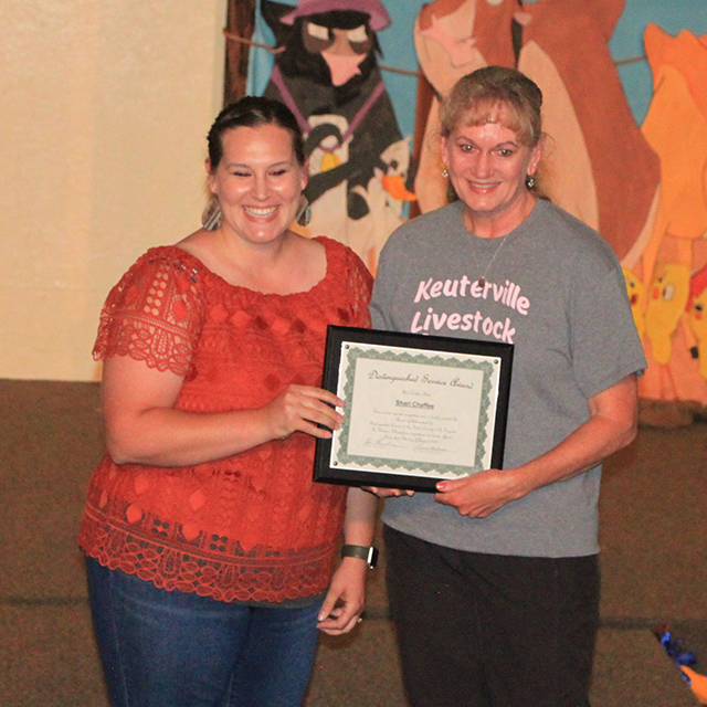 Shari Chaffee, right, was presented the Distringuished Service 4-H Leader award by Kristi Holthaus. Click on the photo for a larger view.