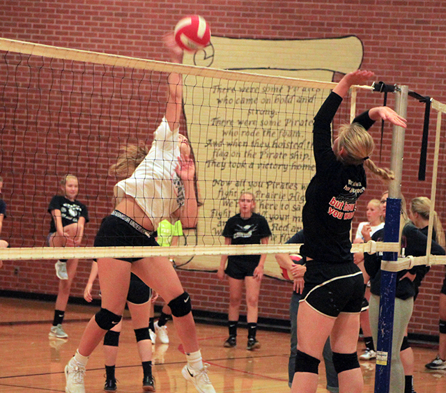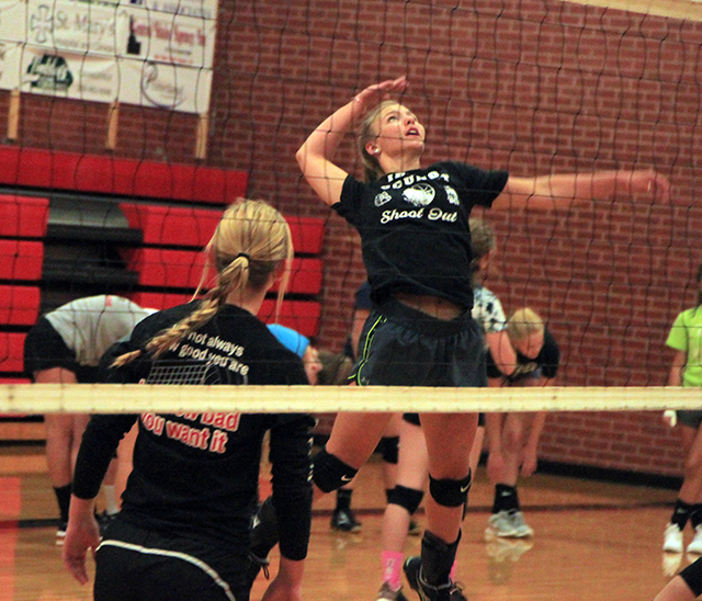 Sierra McWilliams winds up for a spike as Halle Klapprich watches.