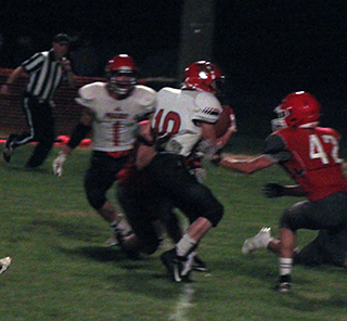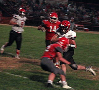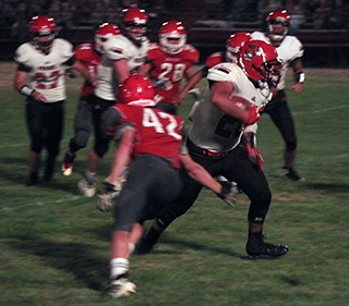 got Prairie to the 6 yard line before time ran out.Prairie received the second half kickoff with Wes Tucker-Hall recovering C.V.’s onside kick attempt at the Prairie 48. Hibbard picked up 10 yards on a run that started to the right and cut back to the middle. Hasselstrom then gained 28 yards on a pass over the middle to put the ball at the 14. Hibbard scored on the next play and Schlader passed to Wyatt Ross for the 2-pointer to make it 46-0. That invoked the running clock with 10:39 left in the third quarter. Ross intercepted a C.V. pass at the CV 46 to end the Rams next possession. Hibbard gained 7 yards and Hasselstrom 19 to move the ball to the 18. Travis Alfrey then went in at tailback and carried on 4 of the next 5 plays including the final play of the drive as he went 6 yards for a touchdown. Schlader passed to Gehring for the 2-pointer to give Prairie a 54-0 lead with 3:37 left in the third quarter. C.V. got a huge kickoff return with Ross making the saving tackle on Aiden Martinez after he had taken the ball 49 yards to the Prairie 30. On third and 3 at the 23, Dalton Ross tackled Martinez for an 8 yard loss and C.V. turned the ball over on downs the next play with an incomplete pass. Prairie took over at their 31 and Hasselstrom carried for 2 yards on the first play and then was taken out of the game. Prairie moved the ball to the C.V. 45 before running the ball over on downs. With the first string defense out of the game for Prairie, the Rams were finally able to move the ball as they went 55 yards in 7 plays for their first touchdown of the game. That came with 1:10 left to play. C.V. then recovered an onside kick at the Prairie 47. They moved down to the Prairie 19 and had time left for just 1 more play. A touchdown pass from Fabbi to Jesse Knox was called back on a C.V. penalty. Since Prairie accepted the penalty that gave C.V. 1 untimed down from the 26 and Fabbi again connected with Knox for a touchdown. Fabbi then passed to Connor Jackson for the 2-pointer to make the final score 54-14. Prairie had 386 yards rushing for the game led by Hasselstrom who had 274 yards on 17 carries. Hibbard added 66 yards on 9 carries. Schlader had 23 yards on 8 carries. Alfrey had 23 yards on 7 carries and Johnson had 4 yards on 1 carry. Schlader was 5 for 12 passing with 1 interception for 53 yards. Hasselstrom caught 2 for 33 yards. Hibbard caught 2 for 17 yards and Gehring caught 1 for 3 yards. C.V. gained 47 yards rushing on 23 attempts. They had negative yards rushing until the final 2 possessions where they had 78 yards rushing. Fabbi was 6 for 18 passing with 1 interception for 92 yards. Hibbard led the Pirates in tackles with 5.5. Johnson had 4.5 tackles. Gehring had 4 tackles. Shane Hanson and Dalton Ross each had 3 tackles. Cole Schlader and Colton McElroy had 2 each. Wyatt Ross had 1 tackle plus an interception. Chase Kaschmitter had 1 tackle. Cronan had 0.5 tackles. Gehring had 1.5 sacks and Cronan had half a sack. The Pirates are now 2-0 on the season and 1 -0 in league play. They play their final non-league game of the season this Friday at Timberline at 7 p.m., smoke permitting. Prairie 22 16 16 0 -54 C.V. 0 0 0 14 -14 P-Hasselstrom 1 run (Gehring pass from Schlader) 11:02 1st P-Hasselstrom 24 run (run failed) 7:50 1st P-Hibbard 4 run (Schlader run) 1:08 1st P-Hasselstrom 32 run (Gehring pass from Schlader) 9:23 2nd P-Hasselstrom 35 run (Hibbard run) 4:16 2nd P-Hibbard 14 run (W. Ross pass from Schlader) 10:39 3rd P-Alfrey 6 run (Gehring pass from Schlader) 3:37 3rd C-Pickering 27 run (run failed) 1:10 4th C-Knox 26 pass from Fabbi (Jackson pass from Fabbi) 0:00 4th ![]() John Gehring reaches high for the ball on a 2-point conversion after Prairie’s final touchdown of the game at C.V. ![]() Cole Schlader cuts inside a C.V. defender to score a 2 point conversion. ![]() Brody Hasselstrom breaks a tackle on his way to a touchdown.