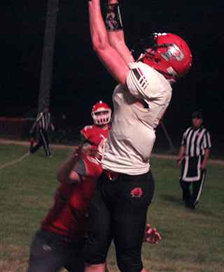 Travis Alfrey gets across the goal line for Prairie's final touchdown of the game. Also shown is Tayden Hibbard.