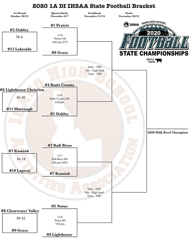 PIRATES BOYS FOOTBALL SCHEDULE FOR 2020The Prairie football team will host Grace this Friday at the Prairie Football Field in Cottonwood at 6 p.m. in a quarterfinal state playoff game. The game would have been in the Kibbie Dome but that venue got closed to any possible high school games when Governor Brad Little moved the state back to Stage 3 in the Idaho Rebounds plan. With a win this week they would likely also host the Oakley-Butte County winner at Cottonwood next week. A bracket can be found below. ![]() The undefeated White Pine League Champion Prairie Pirates! Front from left are Tayden “T.J.” Hibbard, Lane Schumacher, Dalton Ross, Noah Behler, Trenton Lorentz, John Gehring, Cole Schlader, Wyatt Ross, Dean Johnson and Travis Alfrey. Second row from left: Quirt Goeckner, Ravin Cronan, Jesse Cronan, Cole Martin, Chase Kaschmitter, Colton McElroy. Brody Hasselstrom, Shane Hanson and Ambrose Nuxoll. Third row from left: Ben Elven, Ryan Wemhoff, Keenan Shears, Hunter Leal, Wes Tucker-Hall, Matt Coppernoll, Carter Christopher and Brandon Kindrick. Back from left are coaches Jarod Cash, Matt Elven and Ryan Hasselstrom. Not pictured is Ethan Thompson. Photo provided by PHS. ![]() If Prairie wins this Friday, next week’s game would also likely be here in Cottonwood. We are not sure yet where the game would be if we make it to the championship game.