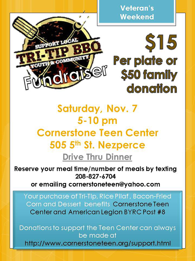 Fundraiser for Nezperce Teen Center As we wrap up construction on the teen center in Nezperce, we invite you to come visit us between 5pm and 10pm on Saturday, Nov. 7, to help us celebrate Veterans Day and our long awaited opening. We will be serving a tri-tip dinner to go. Half the proceeds for the dinner will be given to the American Legion BRYC #8 Post as they cannot do their annual Steak Fondue dinner as they normally do. We'll be serving Tri-Tip, rice pilaf, bacon-fried corn and a dessert for $15 a plate or $50 for a family. For those that want to come in for a visit, we will be showing short videos throughout the evening to honor our veterans and celebrate our nation's military history. We appreciate your patience with the development of the facility, and hope to see you on November 7th. Please make your reservations by texting 208-827-6704 or emailing cornerstoneteen@yahoo.com. Please indicate the number of meals needed and the time you would like to pick up your meal. ![]()