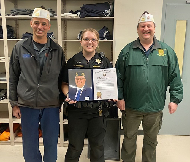 On Tuesday, Nov 24th, Danielle Cochran was presented with the National Veterans of Foreign Wars Life Saving Award. The award was submitted due to her involvements with multiple lifesaving events while working at her full time job at the Nez Perce County Adult Detention Center. Both Chief Cochran with Cottonwood PD and Sergeant Broemmeling with Nez Perce County Adult Detention Center submitted letters recommending her for the award. The award was presented at the Nez Perce County Adult Detention Center by Joe Riener, the VFW District Commander, right, and Dave Frei, the Cottonwood Post 4902 Commander, left. Submitted photo.  Click on the photo for a larger view.