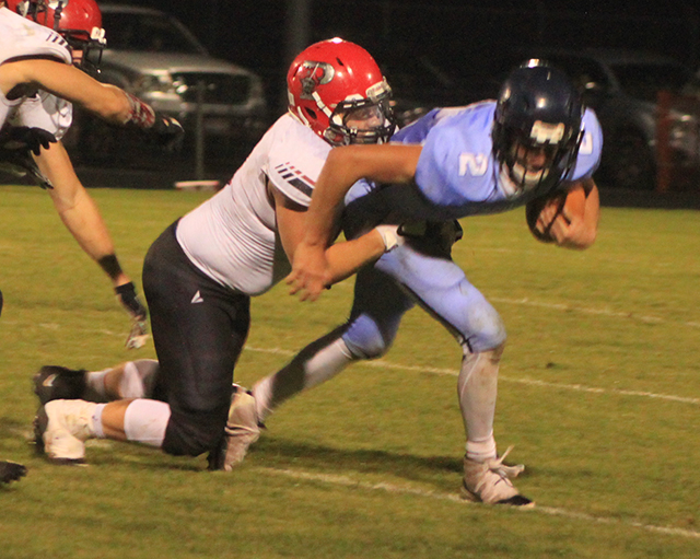 Dean Johnson, shown tackling Lapwai's Titus Yearout for a loss, was named the White Pine League Div. 1 Player of the Year. See article at left for the rest of the Pirates on the all-WPL team. Click on the photo for a larger view.