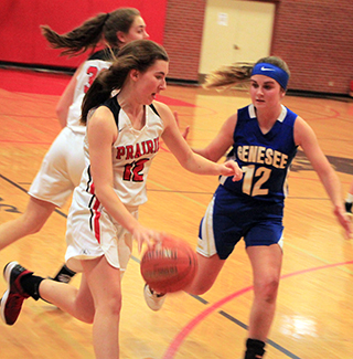 lead in the fourth quarter only to see Lapwai pull away at the end.Lapwai scored first in the game and led 2-5 before Prairie took their first lead on a basket each by Tara Schlader and Delanie Lockett. Lapwai tied it with a free throw but a drive to the hoop by Madison Shears and a free throw by Ellea Uhlenkott gave prairie a 9-6 lead. After a Lapwai basket Schlader scored for an 11-8 lead. Lapwai took back the lead with a pair of 3-pointers against a basket by Uhlenkott but Prairie tied it at 14 to end the first quarter when Shears made a free throw. Lapwai opened the second quarter with a 3-pointer and after 2 free throws in 4 attempts by Lockett, went on a 0-7 run to take a 16-24 lead. Lockett broke the run with a full court drive for a lay-up. Shears sank2 free throws and Kristin Wemhoff took the ball full court for a lay-up to cut the deficit to 2 at 22-24. Lapwai answered with a free throw then a Lapwai assistant coach got assessed a technical foul. Shears made both free throws and on the ensuing Prairie possession Wemhoff scored to give Prairie a 26-25 lead with 52 seconds left in the half. Shears added a free throw to make it 27-25 at the break. Lockett opened the third quarter with a 3-pointer for a 5 point lead but Lapwai answered with 6 straight points to retake the lead at 30-31 with 3:45 left in the third. Schlader scored on an inbounds play to give Prairie back the lead and a basket each by Wemhoff and Schlader and 2 free throws by Lockett gave Prairie a 7 point lead at 38-31 with 1:00 left in the third. Lapwai scored 2 baskets to pull within 3 by the end of the period, 38-35. Lapwai then scored to open the fourth to pull within 1. A free throw by Lockett put Prairie up by 2 but Lapwai answered with a 3 pointer to retake the lead. Prairie took it right back when Hope Schwartz scored 2 free throws with 5:04 left. That lead lasted 12 seconds until Lapwai scored a basket. Schlader then fouled out and Lapwai scored the 2 ensuing free throws. Wemhoff sank the first of 2 free throws but then things fell apart for the Pirates as Lapwai scored 6 straight points to take an 8 point lead with 3:16 left. Shears sank two free throws with 2:41 left but Lapwai answered with a 0-10 run to end the game fueled by several Prairie turnovers. Lockett wound up with 14 points to lead Prairie in scoring with Shears scoring 10. Schlader scored 8 with Wemhoff and Uhlenkott adding 5 each and Schwartz 2. Prairie had a 42-31 edge on the boards led by Lockett, who had a double-double with 14 rebounds. Shears had 3 steals and 4 assists. Prairie was 13 for 41 from the field, 32%, and 17 for 31 at the line, 55%. Lapwai was 22 for 60 from the field, 37%, and 9 for 13 at the line, 69%. In the JV game Prairie dug themselves to big of a hole to start the game and wound up losing 34-38. Prairie went scoreless in the first quarter as Lapwai built a 0-18 lead. Prairie finally scored when Ali Rehder stole the ball and scored at the 6:52 mark of the second quarter. Prairie wound up outscoring Lapwai 11-3 in the second quarter to start their climb back into the game. Isabella Walsh sank a 3-pointer and Rehder scored 2 free throws and another steal for a la-up as Prairie started the quarter with a 9-0 run. After a Lapwai basket Rehder made 2 more free throws and Lapwai answered with a free throw to make it 11-21 at the half. Lapwai scored to open the third quarter but Prairie then went on a 10-2 run to pull within 4 points at 21-25. Jade Prigge scored 6 of those 10 and Riley Enneking scored the other 4. Lapwai broke that run with a 3 but Enneking added a basket to make it 23-28 at the end of the third quarter. A putback by Walsh cut the deficit to 3 but Lapwai answered with 5 straight points. Two baskets by Rehder cut the lead back down to 4 at 29-33. After a Lapwai basket, Prairie again got within 3 on a basket by Rehder and a free throw by Walsh. A Lapwai free throw was answered by a basket from Prigge that got Prairie within 2 at 34-36 with 7 seconds to play. Prairie fouled a Lapwai player in hopes she would miss but she made both free throws and Lapwai wound up winning by 4. Rehder scored 14 to lead the JVs with Prigge scoring 8 and Enneking and Walsh 6 each. Prairie had a 43-39 edge on the boards led by Prigge with 12 and Enneking with 10. Enneking had 7 steals and 3 assists while Rehder had 6 steals. Prairie was 14 for 56 from the field, 25%, and 5 for 8 at the line, 63%. Lapwai was 15 for 49 from the field, 31%, and 6 for 16 at the line, 38%. Prairie 14 13 11 6 -44 Lapwai 14 11 10 25 -60 Prairie-Lockett 4-9, 5-10, 14; Wemhoff 2-5, 1-3, 5; Shears 1-5, 8-12, 10; Uhlenkott 2-4, 1-2, 5; Schlader 4-11, 0-2, 8; Schwartz 0-7, 2-2, 2. 3-pointers-Lockett. Lapwai-Gr. Sobotta 2, 2-2, 8; McCormack-Marks 3, 3-4, 9; Gl. Sobotta 2, 0-0, 5; Herrera 1, 0-0, 2; Oatman 5, 0-0, 11; Gould 0, 1-2, 1; Young 1, 0-0, 2; Mitchell 7, 2-3, 18; Shawl 1, 1-2, 4. 3-pointers-Gr. Sobotta 2, Mitchell 2, Gl. Sobotta, Oatman, Shawl. Vs. Genesee