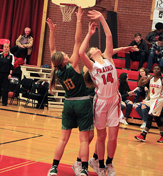 leader in the Division 2 portion of the White Pine League.Shears got things started with a 3-pointer and Wemhoff and Uhlenkott each added a basket as Prairie took a 7-0 lead. Kendrick was able to get within 3 at 10-7 but a basket by Uhlenkott and a 3 by Lockett pushed the lead to 15-7. Kendrick score din the final minute to make it 15-9 at the end of the first period. Kendrick scored to cut the lead to 4 early in the second quarter but a basket by Wemhoff and then a steal she made that led to a basket by Schlader gave Prairie a 19-11 lead. Kendrick scored a free throw and a basket to get within 5 but Prairie ended the first half with a basket each by Schwartz and Shears for a 23-14 halftime lead. Shears then opened the second half scoring with a lay-up and then a 3-pointer for a 28-14 lead. Kendrick cut the lead down to 10 at 30-20 but never got any closer in the second half. Schlader responded with a 3-pointer and after a pair of Kendrick free throws, Shears connected on a 3 to make it 36-22. Twice more Kendrick cut the lead to 11 at 36-25 and 38-27 but each time Prairie responded. The first with a basket by Shears and on the second with a 3-pointer by Forsmann. After a Kendrick basket, Forsmann hit a shot from just inside the 3-point arc to make it 43-29 at the end of the third quarter. A layup by Schlader and a free throw and then a basket by Uhlenkott made it 46-29 2 minutes into the fourth quarter. A Kendrick basket was answered by a basket each from Shears and Wemhoff to make it 52-31, Prairie’s biggest lead of the game. A free throw each by Shears and Ali Rehder against a basket and a free throw by Kendrick finished off the scoring of Prairie’s 20-point win. Shears wound up with 18 points to lead the scoring. Schlader just missed a double-double with 9 points and 11 rebounds. Uhlenkott scored 7. Lockett and Wemhoff scored 6 each. Forsmann scored 5, Schwartz 2 and Rehder 1. Kendrick had a 28-35 edge on the boards. Schlader had 5 steals and 4 assists. Uhlenkott had 3 steals and 3 assists and Forsmann also had 3 assists. Prairie was 22 for 47 from the field, 47%, and 4 for 11 at the line, 36%. Kendrick was 13 for 46 from the field, 28%, and 6 for 11 at the line, 55%. The Prairie JV team came from behind to pull out a 13-12 win in a low scoring, 2-quarter JV game. Prairie scored the first 3 points of the game on a basket by Ali Rehder and a free throw by Olivia Klapprich. Kendrick then hit 2 straight 3-pointers plus a 2 pointer for a 3-8 lead. Prigge scored to make it 5-8 but Kendrick answered to lead 5-10 at the end of the quarter. The second quarter saw Prairie score 8 straight points to take the lead. Prigge scored a pair of baskets then Rehder hit a baseline shot to give Prairie their first lead since the 6:01 mark of the first quarter. Riley Enneking added a putback to make it 13-10 with 1:43 to play. Kendrick answered right back with a basket to cut the lead to 1 with 1:34 left. Both sides had opportunities to score in the final 90 seconds but neither did. Prigge wound up with 6 points to lead the scoring with Rehder scoring 4, Enneking 2 and Klapprich 1. Kendrick had a 19-23 rebounding edge. Prigge had 4 to lead the Pirates. Klapprich had 3 steals and 2 assists to lead both categories. Prairie was 6 for 22 from the field, 27%, and 1 for 2 at the line, 50%. Kendrick was 4 for 28 from the field, 14%, and 2 for 2 at the line, 100%. Prairie 15 8 20 11 -54 Kendrick 9 5 15 5 -34 Prairie-Lockett 2-3, 1-2, 6; Wemhoff 3-9, 0-0, 6; Shears 7-13, 1-4, 18; Uhlenkott 3-8, 1-3, 7; Schlader 4-10, 0-0, 9; Schwartz 1-2, 0-0, 2; Forsmann 2-2, 0-0, 5; Johnson 0-0, 0-0, 0; Prigge 0-0, 0-0, 0; Klapprich 0-0, 0-0, 0; Rehder 0-0, 1-2, 1. 3-pointers-Shears 3, Lockett, Schlader, Forsmann. Kendrick-Ro. Stewart 1-8, 0-0, 2; Stacy 2-5, 0-0, 4; Tweit 3-9, 0-0, 8; Morgan 6-14, 5-9, 17; Taylor 1-6, 0-0, 2; Silflow 0-1, 1-2, 1; Ru. Stewart 0-1, 0-0, 0; Heimgartner 0-1, 0-0, 0. 3-pointers-Tweit 2. Vs. Potlatch
