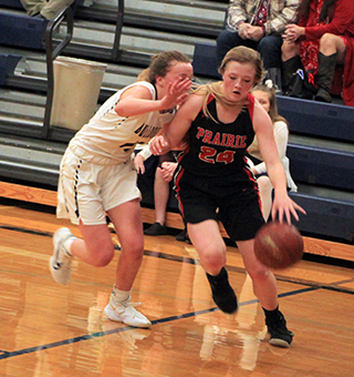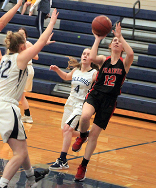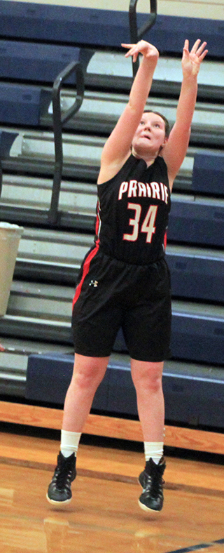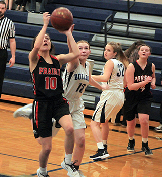 lay-up but Grangeville answered with a free throw for an 11-15 lead.Riener hit 2 more free throws and then Sarah Lustig scored a lay-up on an inbounds play to tie it at 15. About a minute later Lustig scored a putback to give Prairie a 17-15 lead with 3:30 left in the half. Unfortunately those were their last points of the half as Grangeville closed with a 0-6 run to take a 17-21 halftime lead. It was like a different Prairie team came out after the half as Prairie scored the first 14 points of the third quarter to turn a 4-point deficit into a 10-point lead. Olivia Klapprich started things with a basket. Enneking made a free throw after getting fouled on a putback attempt. At the 6:03 mark Rehder got fouled and made both free throws to give Prairie the lead at 22-21. 21 seconds later Rehder got fouled again and again, made both free throws. Isabella Walsh hit a 3-pointer at the 5 minute mark and Klapprich scored a lay-up on a feed from Rehder at the 4 minute mark. Enneking scored a lay-up on an inbounds play with 3:19 left to finish off the run and make it 31-21. Grangeville finally scored their first points of the second half at the 3:03 mark. Rehder answered with a basket and Grangeville countered with another basket. A free throw by Rehder, a basket by Klapprich and a free throw by Alli Geis pushed the lead to 12 at 37-25 with 44 seconds left in the third quarter. Grangeville scored 2 free throws but Chloe Rowland scored a basket to make it 39-27 heading into the fourth quarter. Grangeville never got closer than 10 points in the final period as Prairie was able to answered each score by the Bulldogs. Prairie took their biggest lead of the game when Prigge scored a basket and Rehder a free throw to make it 44-31 with 5:44 left. Prairie equaled that 13 point lead twice more including the final score on a basket each by Enneking and Prigge. Prigge scored the game’s final points with 3:48 left as Prairie worked clock and Grangeville either missed shots or turned it over. Rehder wound up with 10 points to lead the JVs in scoring. Klapprich and Prigge scored 8 each. Enneking scored 7, Riener 5, Lustig 4, Walsh 3, Rowland 2 and Geis 1. Prairie had a 28-22 edge on the boards led by Prigge and Enneking with 5 rebounds each. Klapprich had 5 steals and 4 assists while Walsh and Rehder each had 4 assists. Prairie had 14 assists on 17 baskets. The JVs were 17 for 36 from the field, 47%, and 13 for 21 at the line, 62%. Grangeville was 14 for 34 from the field, 41%, and 8 for 18 at the line, 44%. Prairie 14 9 8 17 -48 Grangeville 10 9 12 14 -45 Prairie-Lockett 3-5, 1-3, 7; Wemhoff 3-5, 2-3, 8; Shears 3-5, 10-10, 17; Uhlenkott 3-6, 2-2, 8; Schlader 3-8, 0-1, 6; Schwartz 0-1, 0-0, 0; Forsmann 1-3, 0-2, 2. 3-pointers-Shears. Grangeville-Barger 3-8, 3-4, 11; Smuth 3-7, 0-0, 7; Brown 5-9, 0-0, 11; Lutz 2-9, 0-0, 4; Vanderwall 3-10, 1-2, 7; Dame 1-1, 0-0, 2; Green 1-1, 0-0, 2; Edwards 0-1, 0-0, 0. 3-pointers-Barger 2, Smith 2, Brown. ![]() Kristin Wemhoff puts up a 3-point shot at Grangeville. ![]() Delanie Lockett shoots at Grangeville. Also shown is Kristin Wemhoff. ![]() Laney Forsmann drives toward the hoop. ![]() Tara Schlader battles in the low post at Grangeville. Also shown is Laney Forsmann. ![]() Ali Rehder goes for a lay-up in the JV game at Grangeville. Also shown is Isabella Walsh. ![]() Olivia Klapprich is about to score in the JV game at Grangeville. ![]() Riley Enneking shoots in the JV game at Grangeville. Also shown are Olivia Klapprich and Jade Prigge, 33. ![]() Isabella Walsh shoots a 3-pointer in the JV game at Grangeville. *indicates league game NOVEMBER