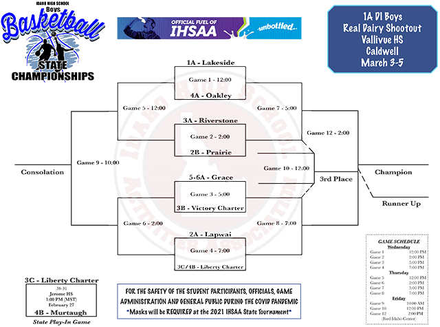 Pirates opened again Riverstone The Prairie Pirates will open against District 3 champion Riverstone, a private school located in Boise. Riverstone is 13-0 on the season and 10-0 in the Western Idaho Conference. Prairie brings a 17-5 record into the tournament having finished 2nd in both the White Pine League and District Tournament. In the other half of Prairie’s bracket are 14-4 Lakeside and 19-3 Oakley, the District 1 and 4 champions, respectively. In the other half of the bracket are 10-12 Grace, the District 5-6 Champion against 19-4 Victory Charter, the District 3 runner-up and 17-4 Lapwai against 12-11 Liberty Charter, the District 3 third place team who got in by winning a play-in game against Murtaugh, the District 4 runner-up. The tournament is on Wednesday, Thursday and Friday this year due to Covid, with the championship game on Friday at 2 p.m. MST, at the Idaho Center. All other games are at Vallivue High School in Caldwell. Update: Prairie lost 64-73 to Riverstone and were to play Oakley at 11 a.m. PST Thursday, March 4 in a loser-out game. If they win they would play again at 9 a.m. PST on Friday, March 5 against the winner of the Victory Charter-Liberty Charter consolation semifinal. ![]() The 1A-D1 State Basketball bracket. All times are MST.