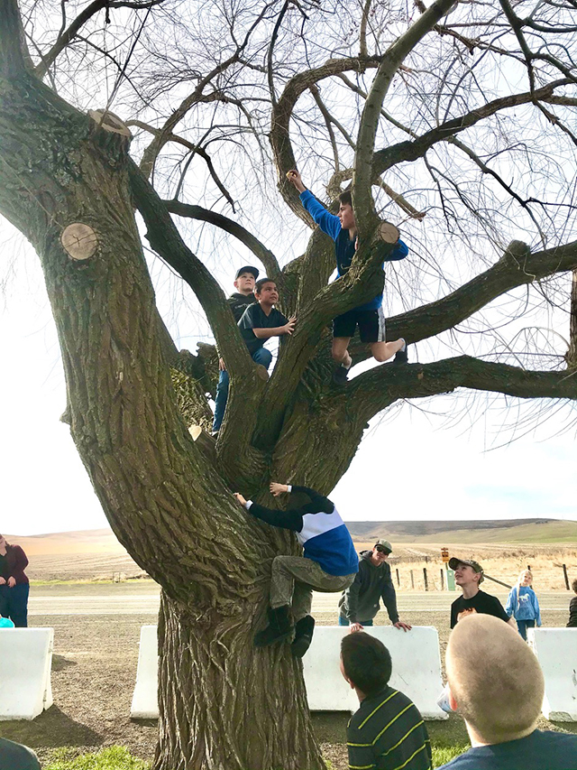 Clay Weckman finds the Golden Egg for the 8-12 year odl group in the large tree near the Greencreek Hall.