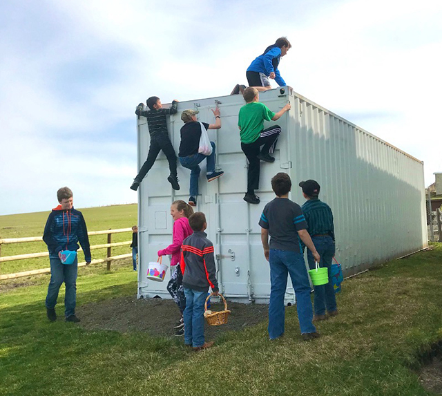 8-12 year olds climb a storage container as they hunt for eggs at Greencreek.
