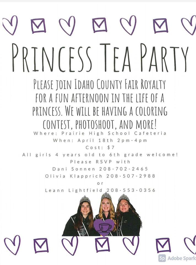 Princess Tea Party is Sunday The Idaho County Fair Royalty will be holding a Princess Tea Party on Sunday, April 18 from 2 to 4 p.m. in the Prairie High School Cafeteria. Cost is $7 with all girls ages 4 years old through 6th grade welcome to attend. There will be a coloring contest, photoshoot and more. Please RSVP to Dani Sonnen, 208-702-2465, Olivia Klapprich, 208-507-2988 or Leann Lightfield, 208-553-0356. See the flyer below. ![]()