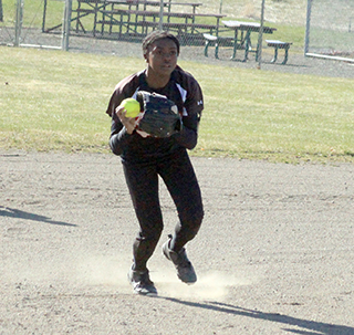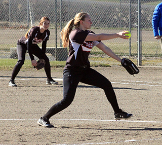 Madison Shears is about to throw to third to complete and innin-ending double play after catching a line drive against Nezperce. ![]() Mackenzie Key pitches a shutout against Nezperce. Also shown is first baseman Tara Schlader. March