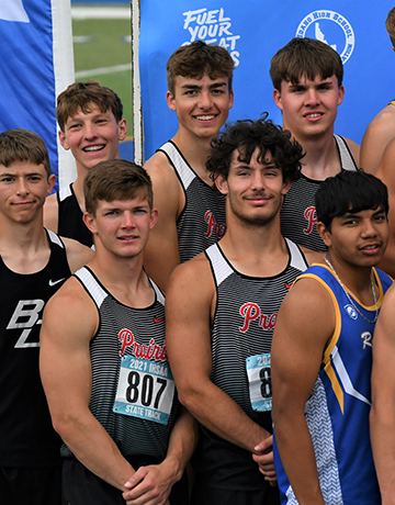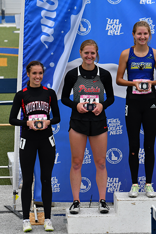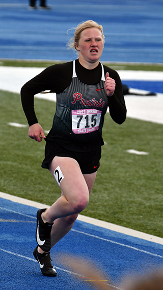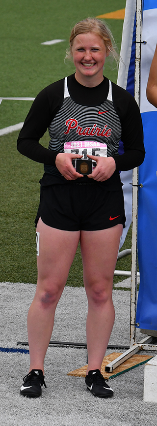 The Prairie track team brought home several medals from the State Track Meet at Middleton this past weekend. None was bigger than the gold medals won by the girls 4x200 relay team of Alli Geis, Ellea Uhlenkott, Julia Rehder and Kristin Wassmuth. They won with a time of 1:51.08. It is the 4th consecutive state track meet that Prairie’s 4x200 girls team placed first. An Uhlenkott was on the team each year as Ellea was on the 2019 team and her sister Laney was on the 2017 and 2018 teams. The same group of girls also earned a 4th place medal in the 4x100 relay where they had a time of 53.09. The top individual finisher for Prairie was Matt Coppernoll who placed second in the discus with a toss of 140’8”. He also placed 8th in the shot put with a mark of 41’¼”. Uhlenkott also earned medals in both hurdles races. She placed 3rd in the 300 hurdles in 48.43 and 4th in the 100 hurdles in 16.75. In the 100 meter prelims she set a new personal best with a time of 16.12. Wassmuth also earned a pair of individual medals as she placed 6th in both the 200 meter and 400 meter dashes. Her time was 27.28 in the 200 and 1:01.05 in the 400, both personal best marks. Also earning state medals for the boys were the 4x100 and 4x200 relays. Jesse Cronan, Cole Martin, Zach Rambo and T.J. Hibbard made up both teams and finished 4th in both races. They had a time of 45.95 in the 4x100 and 1:35.98 in the 4x200. The top 6 finishers in each event receive medals. Competing at state but not earning medals were Hibbard in the discus with a mark of 128’4” to place 8th, Shane Hanson in the discus with a mark of 120’2” to place 10th and Cronan in the long jump with a mark of 16’7” to place 14th. As a team the boys tied for 13th with 20 points while the girls tied for 5th with 32 points, 2 points out of fourth place where they would have received a team trophy. ![]() ![]() ![]() ![]() Matt Coppernoll competing in the discus and on the medal stand after receiving his second place medal. . ![]() ![]() ![]() At left is Ellea Uhlenkott in the 100 hurdles. In the middle after receiving her fourth place medal in that race. At right she is on the medal stand after receiving her third place medal in the 300 hurdles. ![]() ![]() Cole Martin takes the handoff from Jesse Cronan in the 4x100 relay. At right are T.J. Hibbard, Zach Rambo, Cronan and Martin on the medal stand after earning a 4th place medal in the race. ![]() T.J. Hibbard takes the baton from Zach Rambo in the 4x200 relay. They teamed up with Cole Martin and Jesse Cronan to also finish 4th in this event. ![]() ![]() Kristin Wemhoff in the 400 meter dash. At right she is on the medal stand after finishing 6th. She also placed 6th in the 200 meter dash. ![]() T.J. Hibbard in the discus at State. ![]() Shane Hanson in the discus competetion. All State Track photos by Cara Uhlenkott. |