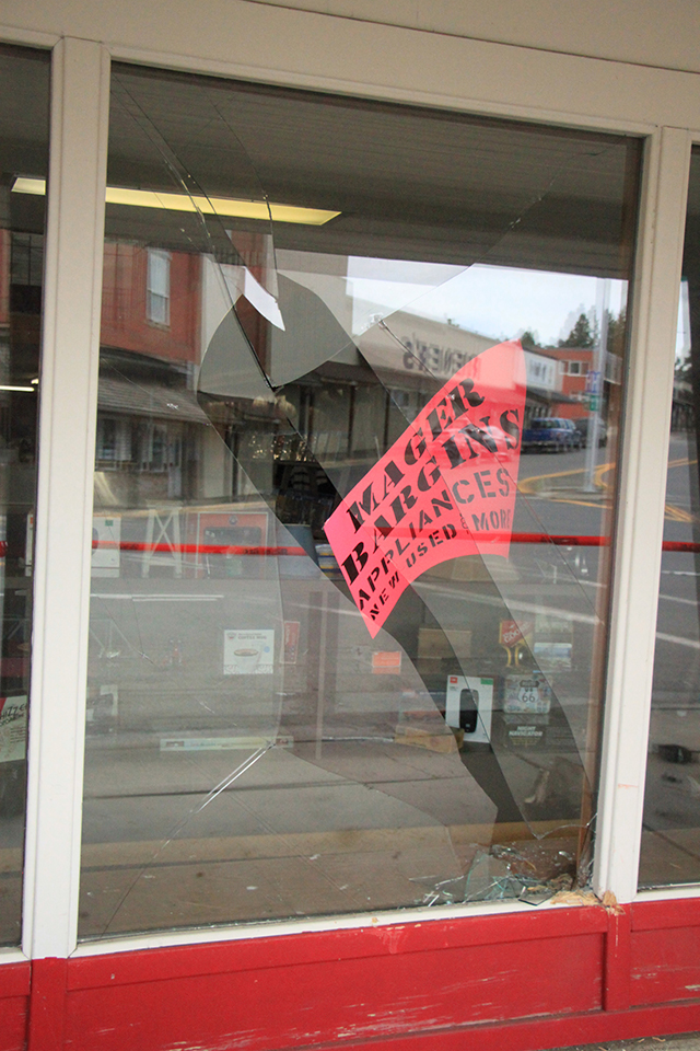 busted plate glass window at Mager Bargains (formerly Hoene Hardware)