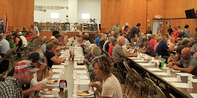 The crowd came back this year for the Greencreek 4th of July Celebration after taking a hit last year from Covid. The top photo shows the breakfast crowd at about 9 a.m. while the lower photo shows some of the crowd outside beneath the big shade tree just before the auction. Click on each photo for a larger view.