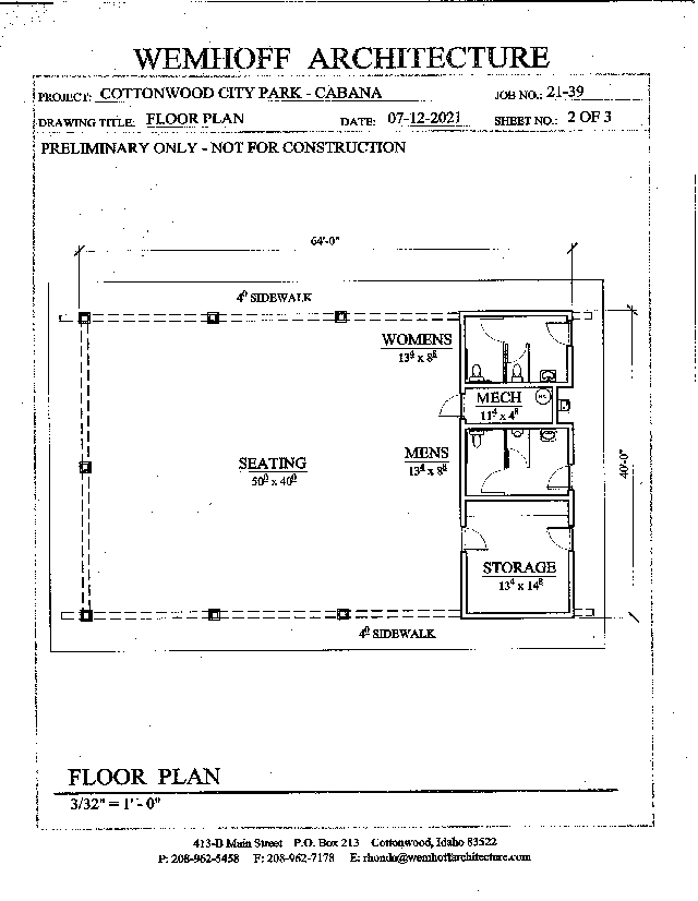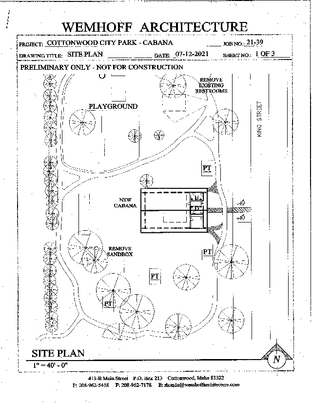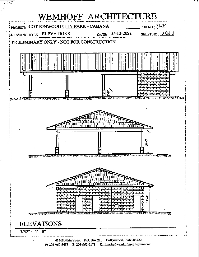 Cottonwood City Council meets The Cottonwood City Council passed resolutions to raise the water and sewer rates by 3% each at their July meeting Monday, July 12. They also had representatives from Walco, Inc. ask for a 4.9% increase in garbage pickup rates citing their increasing costs. In other business Dodd Snodgrass of CEDA was present to talk about the grant application for the park pavilion project. Brandon Higgins was present representing Wemhoff Architecture and shared a preliminary proposal for the project. They are looking at removing the current restrooms and cabana and putting a larger structure where the cabana is now that would have handicap access restrooms and a much larger covered space. Later in the meeting CEDA was approved to be the grant writer at a cost of $3500. These kind of grants can be worth up to $225,000 and there would be some community match involved either in in-kind value or donations. Architect’s drawings of the proposed facility can be seen on page 4. Serena Lockett was present representing Cottonwood Summerfest and asked about waiving the open container law during the street dance in a designated area. City Attorney Joe Wright pointed out that according to ordinance an application needs to made and then acted upon at a council meeting. The council has a budget hearing on July 26 and an application could be acted upon at that time. She was also asked to meet with police chief Terry Cochran to make sure they are on the same page as to where the boundaries would be. In later action the council approved a catering permit for Summerfest. In reports Cochran reported you can now text message 911 if you are in a situation or location where making a call isn’t possible. In the water report Pat Holthaus reported they pumped 6 million gallons and sold 5.4 million resulting in a 10% loss. Tests came back good. Roy Uhlenkott reported they found a leak near Fred Seubert’s house. Lynn Guyer reported not much new has happened in the sewer department since last month. Uhlenkott reported the infiltration of water into the system has gone way down recently due to the dry conditions. Keith Holcomb reported the mag chloride application is done on the gravel streets and chip sealing is coming up within a month. Linda Nida reported they had just 1 call for the fire department in the past month which was a field fire. In unfinished business Uhlenkott reported they are still working on getting the information together for the sewer pipe, sump pump, etc. requirements which would then be put into ordinance form. Ordinance #254 was read and approved updating the city’s flood ordinance at the request of FEMA. Under new business the council voted to approve the Fiscal Year 2021 amended budget and the Fiscal Year 2022 proposed budget. A budget hearing will be held Monday, July 26, at 7 p.m. The meeting adjourned at 8:54 p.m. The budget hearing is set for Monday, July 26 and the next regular meeting is set for Monday, August 9, at 7 p.m. ![]() ![]() ![]() Above are architest drawings of the proposed new pavilion/rest room facility at the Cottonwood City Park. These are a preliminary proposal and may be quite different from the final structure.