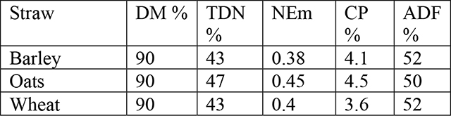 a third of what is produced on a normal year.Why did this happen? A couple of major events caused this to happen. First, we have been extremely dry since April. Rainfall amounts have been way below normal. In addition, there were many nights that had low temperatures around the freezing mark in late April and May. Add these factors together and we have very limited grass and forage growth which has resulted in a tremendous shortage of forage in Northern Idaho. Many cattle producers are trying to locate hay to buy, but there just isn’t any available locally. I have already heard of hay prices out of the area hitting $300 a ton and more. At these prices, it will take the profit right out of the cattle business. Cattle producers may want to consider buying and feeding straw as a substitute for hay this winter. Straw can be successfully fed to beef cows during the winter as a portion of the winter cow ration. Producers will have to balance the ration with proper supplements, vitamins and minerals to meet the cow’s nutrient requirements. Which Straw is Best to Feed? According to Dr. Reid Redden, Extension Specialist with Texas A&M AgriLife Extension, oat straw is the most palatable and nutritious, followed by barley straw. Wheat straw has the lowest nutritional value of the main cereal crops. Dr. Redden put together the following table outlining the nutrient content of straws common to our area: Nutrient Content of Barley, Oat and Wheat Straw: ![]() How Much Straw Can Be Fed? Beef cows can utilize straw very well, in fact, rations can contain 50 to 60% straw if combined with a high energy feed and a feed high in crude protein. Dr. Roger Brownson, former Beef Cattle Specialist at Montana State University, authored a publication entitled, Emergency Rations for Wintering Beef Cows, that can be found in the Cattle Producer’s Library. In this publication, Brownson provided sample rations for dry pregnant cows weighing 1000 pounds and rations for 1,100-pound cows nursing calves. Below are a couple of rations suggested by Dr. Brownson: 1000-pound pregnant cows Feed Intake CP Energy (ME) (lb) (lb) (Mcal) Daily requirement 19.6 1.6 17.3 Ration #1 Straw 11 0.3 7.4 Alfalfa hay 11 1.6 10.4 Total 22 1.9 17.8 Ration #2 Straw 12 0.4 7.4 Barley grain 6 0.7 8.1 20% Supplement 1 0.2 1.4 Total 19 1.3 16.9 Ration #2 is marginal in protein and energy. Additional intake is needed and or more protein should be added in order to meet the requirements. 1,100-pound cows nursing calves Feed Intake CP Energy (ME) (lb) (lb) (Mcal) Daily Requirement 21.6 2 19.9 Ration #1 Straw 10 0.3 6.7 Alfalfa hay 14 2.1 13.3 Total 24 2.4 20 Ration #2 Straw 12 0.4 7.4 Barley grain 7 0.8 16.3 20% Supplement 2 0.8 2.8 Total 21 2.0 26.5 All these rations included free choice mineral and vitamin supplements. The rations listed above were formulated for small cows. Most of the mature cows in north central Idaho are much bigger than the 1000-pound cows listed in the example. Larger cows will have a different intake and nutrient requirements than what is listed in the example. How Much Does Straw Cost? I don’t have an answer for that. It will be higher than in years past but still considerably cheaper than hay right now. Normal years the cost would be somewhere between $40 to $50 per ton. Wheat, barley and oat yields will be lower this year as well. Some grain growers may be interested in selling straw to offset the loss in income from reduced yields. They may allow for the harvest of straw especially if they don’t have to do any of the baling and hauling. Summary: The shortage of hay will challenge cattle producers this year. There are forage options available for cattle producers and straw is one of those options. In the past, our ancestors fed a lot of straw during the winter months in this part of the country. As was outlined in this article, straw can be fed successfully to beef cows. Straw can be used in combination with grass hay, alfalfa, barley, corn, soybean meal, canola meal, commercial protein supplements and much more. There are many combinations that can be used to balance a ration. If straw is used in the ration, it will be critical that the cows are on a good vitamin and mineral supplementation program. Good luck as we work through this difficult year. (References are available upon request)