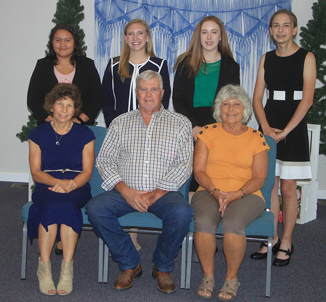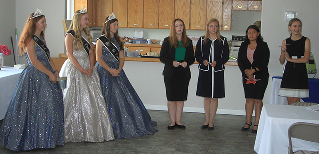 ![]() The candidates and current royalty with Royalty Adviser Joyce Sonnen. Back from left are Jazmin Ove, Chloe Rowland, Riley Enneking, Kaylee Graves and Joyce Sonnen. Front from left are Leann Lightfield, Dani Sonnen and Olivia Klapprich. ![]() The candidates with the judges. Front from left are Michelle Koepl and Roger and Verla Nelson. Back from left are Jazmin Ove, Chloe Rowland, Riley Enneking and Kaylee Graves.