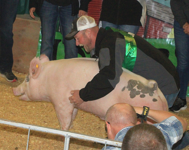 Cody Funke is the first 2-time Kiss the Pig winner and had to chase the grand champion hog around the sale arena before he could give him a smooch. Click on the photo for a larger view.