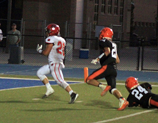Brody Hasselstrom finishes off a 37 yard pass play for a touchdown in the second half against Glenns Ferry at Middleton.