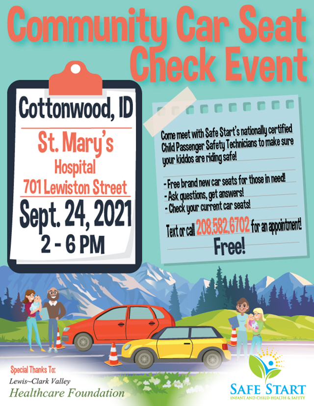 A second check event will be held in Grangeville on Thursday, September 23 from 1-6 PM at the Soltom Center across from Syringa Hospital. Safe Start, a program of Northwest Infant Survival and SIDS Alliance, received a grant from the Lewis-Cark Valley Healthcare Foundation to provide safe infant sleep and child passenger safety services to those living in and around Cottonwood, Grangeville, Lewiston and Moscow areas. Safe Start’s mission is to ensure every child celebrates their first birthday and beyond free from accidental death and injury. We provide free child health and safety prevention education, car seats, cribs and sleepsacks to anyone living in Idaho or Washington. www.safestartnw.org for more information. Northwest Infant Survival and SIDS Alliance is a non-profit, 501C3. ![]() |