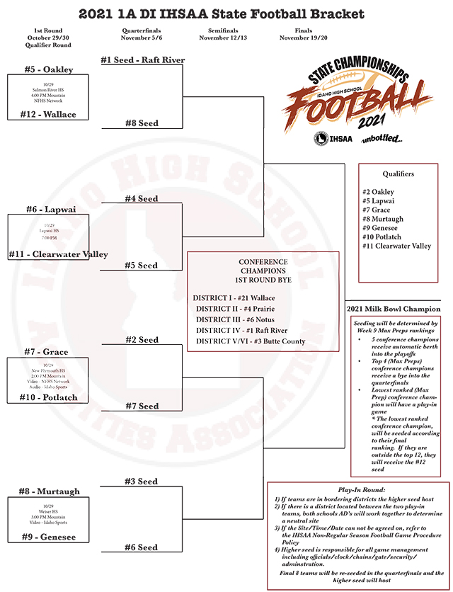 They will play either Friday, Nov. 5 or Saturday, Nov. 6, depending on their opponent. The state is using Maxpreps rankings to seed the field this year and Prairie is ranked at #4. Rankings for teams qualifying are: Raft River, #1; Oakley #2; Butte County #3; Prairie #4; Lapwai #5; Notus #6; Grace #7; Murtaugh #8; Genesee #9; Potlatch #10; Clearwater Valley #11 and District 1 champion, either Wallace or Lakeside, who split on the season and likely play a Kansas tiebreaker, #21 and #22 respectively. The Wallace-Lakeside winner will be the #12 seed in the field. First round matchups are Oakley vs. Wallace-Lakeside winner; Lapwai vs. C.V.; Grace vs. Potlatch and Murtaugh vs. Genesee. Teams will be seeded into the second round according to their MaxPreps rankings which would have Oakley as the #2 seed if they win, even though they aren’t a league champion. Prairie’s likely opponent as the #4 seed would be Lapwai if they beat C.V. If Lapwai loses Prairie's likely opponent would be #6 Notus. The current state bracket is below. All games at 7 p.m. unless indicated AUGUST 28-vs. Glenns Ferry @ Middleton, 6:30 p.m. MDT, won 48-14