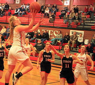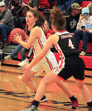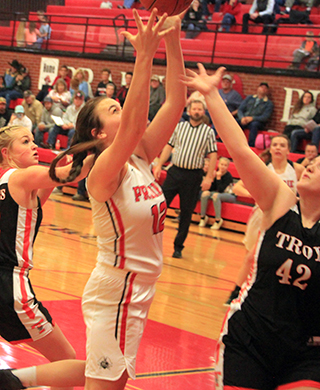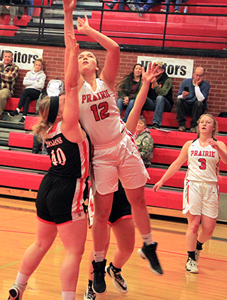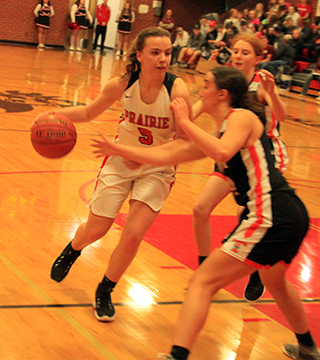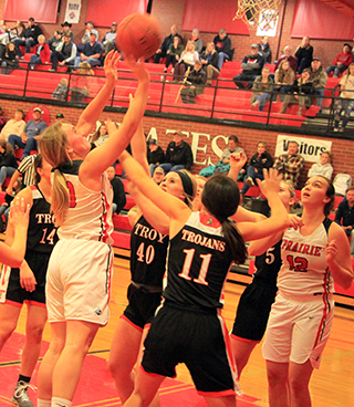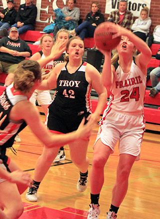 Lady Pirates win season opener The Prairie Lady Pirates struggled in the second quarter but pulled away from Troy in the second half for a 58-31 win at Cottonwood Thursday, Nov. 18. ![]() Tara Schlader scored the first points of the game on an inbounds feed from Kristin Wemhoff. However, by the time Prairie scored again, Schlader was on the bench for the rest of the half with 3 fouls. Wemhoff made it 4-0 with a pair of free throws. After a Troy 3-pointer, Prairie scored 8 of the next 9 points for a 12-4 lead. Molly Johnson scored a putback, Josie Remacle scored a free throw and Ali Rehder scored inside to make it 9-3. After a free throw by Troy, Delanie Lockett converted a 3-point play to make it 12-4 with 1:58 left in the first quarter. Troy cut the margin to 5 by the end of the period on 2 free throws and a putback against a single free throw by Wemhoff. In the second quarter, Troy’s Isabelle Raasch got hot. She had hit the 3-pointer to get Troy’s scoring started but scored Troy’s first 9 points of the second quarter as the Trojans tied the score at 17-17 with 4:30 left in the half. A free throw by Wemhoff and then a feed by her to Laney Forsmann for a lay-up made it 20-17. 2 free throws by Troy were answered by a jumper from the elbow by Wemhoff. Raasch then tied it at 22 with her third 3-pointer of the game. Each side scored a free throw as it was tied again at 23-23. With 33 seconds left in the half, Johnson took a pass from Lockett and was fouled while scoring a lay-up. She added the free throw to give Prairie a 26-23 lead at the half. Troy scored to open the second half and cut the lead to 1, but the rest of the third quarter belonged to the Pirates. Prairie scored 17 straight points to take a commanding 43-25 lead with 2:30 left in the third quarter. Forsmann started the run with a 3-pointer. Wemhoff then pulled down a defensive rebound and drove the length of the court for a lay-up. Forsmann scored inside on a feed from Schlader, who picked up her fourth foul shortly afterward. Remacle came in for Schlader and scored a pair of baskets. Wemhoff, Lockett and Johnson each added a basket to make it 43-25. On the defensive end during that run, Prairie was forcing numerous Troy turnovers as the Trojans had 13 in the third quarter alone. They also put the clamps on Raasch, who went scoreless in the second half and attempted just 2 shots. Troy broke their scoring drought at the 2:24 mark then Prairie scored the final 4 points of the quarter on a basket each by Lockett and Schlader for a 47-27 lead heading into the fourth. Prairie had outscored Troy 21-4 in the quarter. Prairie scored the first 4 points of the fourth quarter on a basket by Wemhoff and 2 free throws by Remacle for a 51-27 lead. Troy scored a free throw then Prairie scored the next 5 points. Rehder scored a basket and Wemhoff, Gracie Farr and Riley Enneking each added a free throw to make it 56-28 with 1:27 to play. Troy scored the next 3 points then Prairie finished off the scoring with a basket by Isabella Walsh on a feed from Enneking. Wemhoff wound up with 16 points to lead all scorers and added 7 rebounds, 7 assists and 4 steals. Remacle came off the bench to score 9 points and added 6 rebounds and 3 steals. Lockett, Johnson and Forsmann each scored 7 points. Schlader and Rehder scored 4 each. Walsh scored 2 and Farr and Enneking scored 1 each. Raasch led Troy with 15 points, all in the first half. No one else had more than 5 points. Prairie outrebounded Troy 36-32. Forsmann tied Wemhoff for the team lead with 7 rebounds. Out of 22 made baskets, Prairie had 17 assists, showing they did a great job of moving the ball. Prairie was 22 for 48 from the field, 46%, and 13 for 30 at the line, 43%. Troy was 9 for 33 from the field, 27%, and 10 for 20 from the line, 50%. Troy hit just 3 of 16 shots from the field in the second half. Prairie is now 1-0 on the season and in league play. The JV game was only 2 quarters but was similar to the varsity game in that Troy kept in close in the first half of the game and then Prairie pulled away for a 33-19 win. Unlike the varsity game, where Prairie never trailed, Troy scored first in the JV game. Isabella Walsh tied it at 2 then Troy took back the lead with a free throw. Walsh scored again but Troy answered for what turned out to be their final lead. Lexi Schumacher scored a pair of baskets for an 8-5 lead. After Troy cut the lead to 1, Taylor Riener scored on a drive for a 3-point lead. Alli Geis scored on an inbounds play then Walsh stole the ensuing inbounds pass by Troy and scored to make it 14-7. Troy scored the next 4 points to cut the lead to 3. Schumacher and Geis each scored then Troy hit a 3 and then a 2 to pull within 2 by the end of the quarter, 18-16. The quarter break cost Troy any momentum they may have had through as Prairie scored the first 11 points of the second quarter to take control of the game. Geis scored 2 baskets and Sarah Lustig and Schumacher each made 2 free throws to make it 26-16. Lustig, Walsch and Lustig again each hit 1 of 2 free throws to make it 29-16. Troy finally scored in the quarter with 2 free throws with just 2:21 left to play. Schumacher answered with 2 free throws. Troy scored another free throw then Riley Enneking ended the scoring with a basket with 5 seconds left to make it 33-19. Schumacher scored 10 points to lead the scoring. Geis scored 8, Walsh 7, Lustig 4 and Reiener and Enneking 2 each. Prairie dominated the boards 20-13 with Walsh grabbing 7 boards while Ellie Nuxoll came in late and pulled down 5 rebounds. Geis and Lustig had 4 rebounds each. Walsh had 3 steals and 5 rebounds. The JV’s were 12 for 31 from the field, 39%, and 9 for 19 at the line, 47%. Troy was 7 for 15 from the field, 47%, and 4 for 16 at the line, 25%. Prairie 13 13 21 11 -58 Troy 8 15 4 4 -31 Prairie-Wemhoff 5-12, 6-14, 16; Lockett 3-4, 1-1, 7; Schlader 2-4, 0-2, 4; Johnson 3-8, 1-2, 7; Forsmann 3-6, 0-0, 7; Remacle 3-8, 3-6, 9; Rehder 2-6, 0-0, 4; Klap