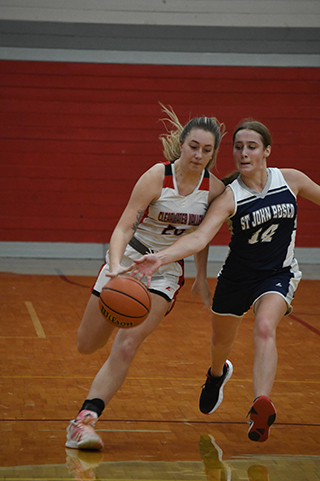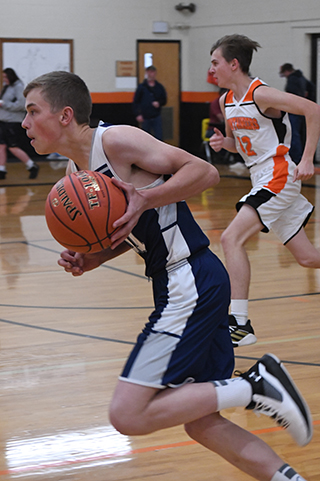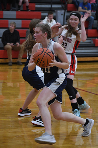 score more than 8 points in any quarter. C.V. led 5-12 after 1 quarter and 13-26 at the half. Each team scored 6 in the third quarter and C.V. pulled away in the fourth, outscoring the Lady Patriots 5-14. Jade Prigge, one of 2 seniors on the team along with 5 freshmen, led the scoring with 11 points. Fellow senior Dani Sonnen scored 4 as did Julia Wassmuth. Raylie Warren scored 3 while Sarah Waters scored 2. The Lady Patriots are 0-1 on the season. SLB 5 8 6 5 -24 CV 12 14 6 14 -46 SJB-Prigge 5, 1-3, 11; D. Sonnen 2, 0-0, 4; Chmelik 0, 0-0, 0; Waters 1, 0-0, 2; Wassmuth 2, 0-2, 4; R. Sonnen 0, 0-0, 0; Warren 1, 1-5, 3. 3-pointers-none. C.V.-Pfefferkorn 2, 1-2, 5; Simmons 0, 2-2, 2; Morrow 0, 0-0, 0; Soun 0, 0-0, 0; Edwards 5, 0-0, 13; E. Lundgren 1, 2-2, 4; Schilling 3, 4-6, 10; L. Lundgren 0, 0-0, 0; To. Yocum 3, 3-4, 9; Tr. Yocum 1, 0-0, 3. 3-pointers-Edwards 3, Tr. Yocum. ![]() Cody Wassmuth brings the ball upcourt at Meadows Valley. ![]() Tory Chmelik brings the ball up court against C.V. Also shown is Levi Wassmuth. ![]() Cody Wassmuth with the ball at C.V. ![]() Tory Chmelik goes for a lay-up at C.V. ![]() Julia Wassmuth with the ball at C.V. ![]() Sarah Waters goes for a steal at C.V. Photos by David Rauzi. NOVEMBER